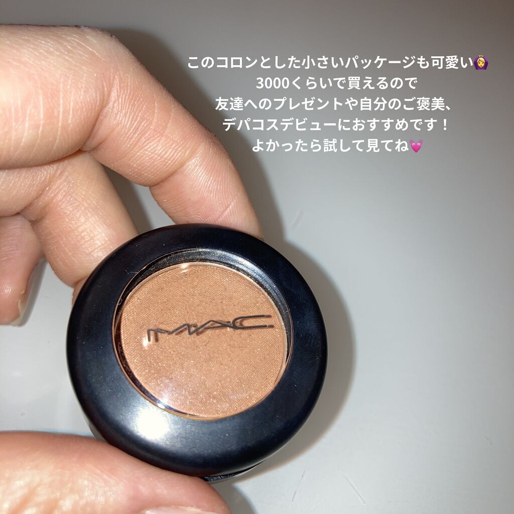 MACスモールアイシャドウ(テクスチャー)です✨明るめのオレンジベージュみたいなカラーで、使いやすいです😊マットではないですが、ベースに薄く付けたりと使い勝手の良いやつですd('∀'*)MACの単色も集めたくなるなるで気付けば何個あるんだろ😳...