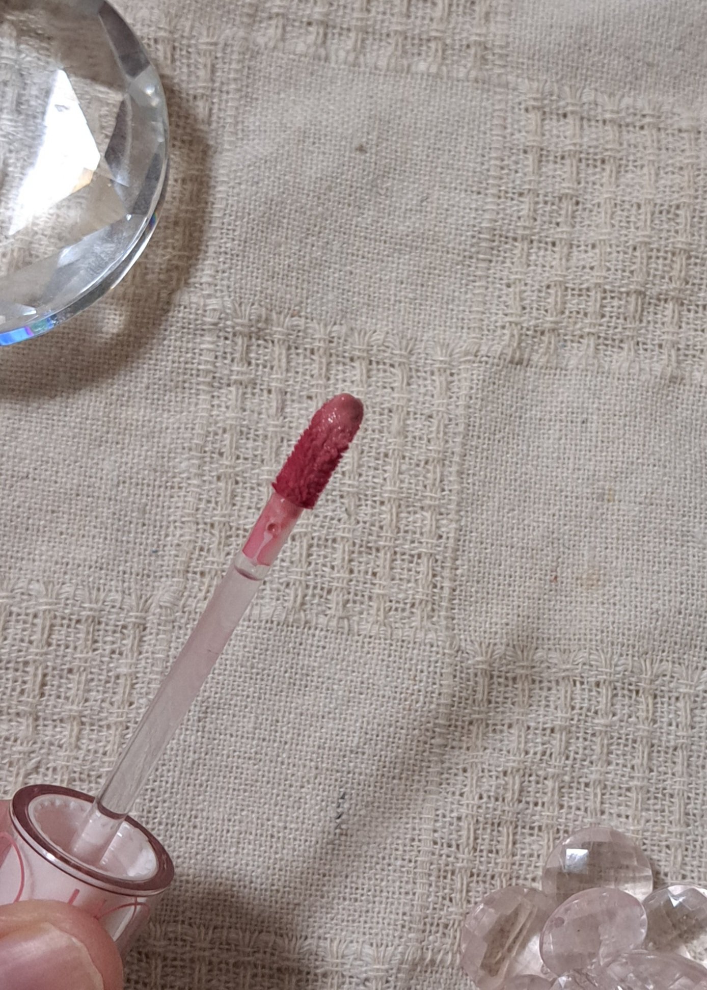 つけてみたら、思っていたより自然 唇にスっと馴染む色味だった(個人の意見) ティントだけど程よくてかてかして、いいよね ティッシュオフしたら、簡単に色味取れたわ 微妙になった