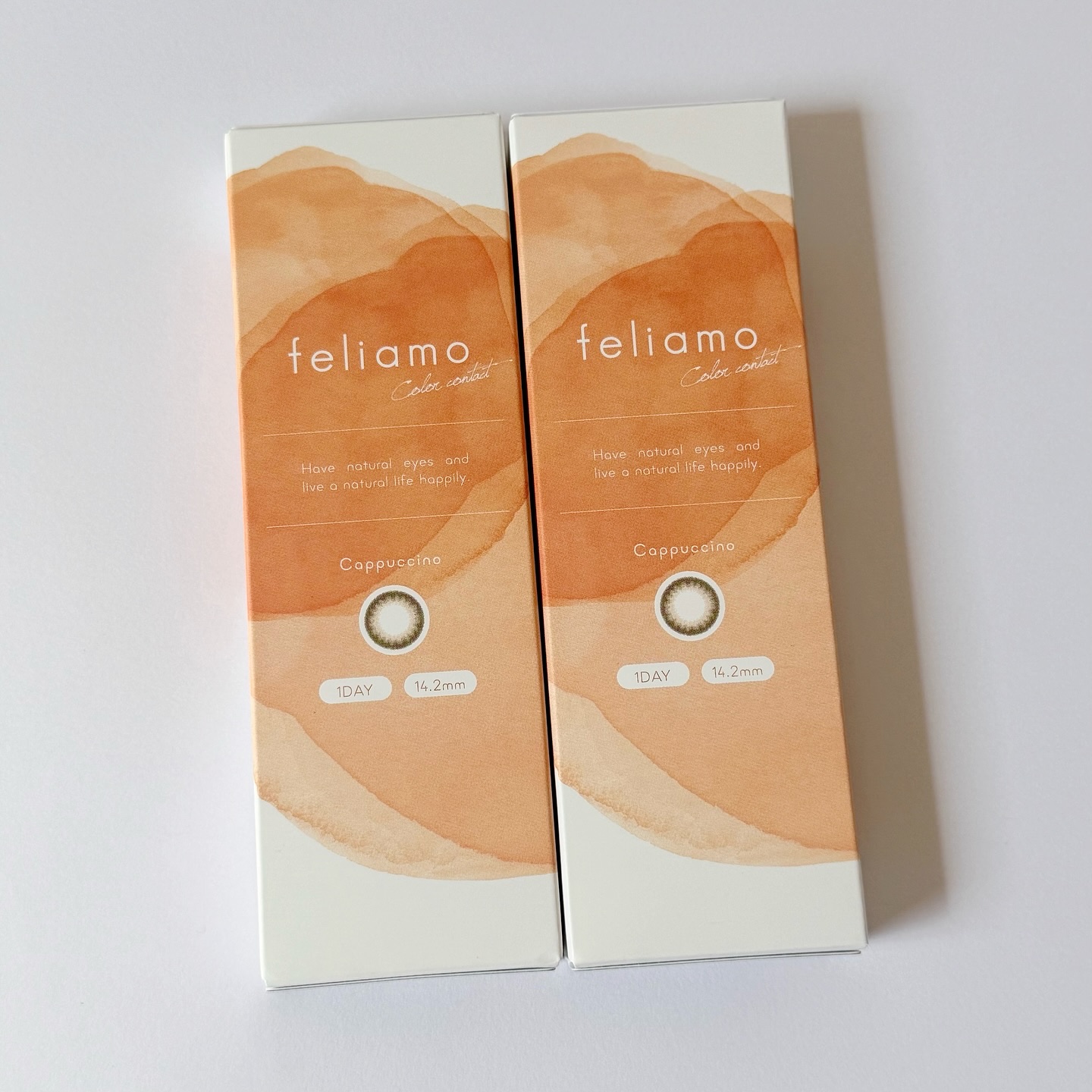 feliamoカプチーノDIA14.2着色直径13.0BC8.6含水率55%価格1760円(10枚入)初めて使ったカラコンナチュラルで可愛いけどこれじゃなきゃいけない理由もないかな〜あとは何故か下にズレがちだった🥲当時メイク下手だったから今使...