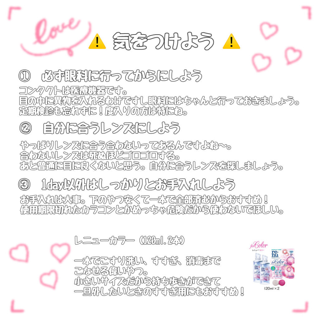\超簡単!✨どんなメイクより垢抜けた方法!/成瀬。と申します!今回が初投稿になります。どうぞよろしくお願いいたします(*´`)今回は、私がどんなメイクよりも垢抜けたな~と思った方法をご紹介致します。ダイエットやセンスを磨く!というのも勿論大切ですが、今回は何の努力もなく簡単に垢抜けられる方法です。それはズバリ…“ カラーコンタクト ”です。カラーコンタクトを使うことで私のメイク人生が一気に変わりました。体験談からお話させていただきます。まず私は幼少期からハチャメチャに目付きが悪く、全然睨んでいないときでも「何睨んでんの?😡」と友人にキレられることが日常茶飯事でした…。そんな私も高校生になり、メイクを覚えました。中学から目が悪くなっていたので、眼鏡ちゃん👓になってました。(遊ぶときは見えないの我慢して裸眼でした)コンタクトはお金がかかるしレンズを入れるのが少し怖かったのでコンタクトという選択肢はありませんでした。勿論目付きが変わることはなく…😭どんなに上手にアイメイクができても、“目付きが悪い女の子”というイメージがどうしても抜けきれませんでした。そんな私の転機は高校を卒業し、社会人一年生となった今年2021年の夏に遡ります。夏に友人に誘われたライブに行くため、見えないと困る+眼鏡は掛けたくない…😭という事態が発生。急遽眼科に向かいコンタクトの検査を受けることに。コンタクト用の度を測り、片目30分、もう片目5分掛けて初めて着用したカラーコンタクト。つけて鏡を見た瞬間驚きました。“え…?誰…?”そこには目付きの悪い女の子は居らず、瞳がぱっちりとした可愛い女の子がいたのです!自分で自分を可愛いというのもアレですが…笑本当に、その日ほど自分が可愛いと思った日はそこまでの自分の人生の中ではなかったのです。その日購入したカラコンで満を持してライブへ!友達が最前席を当ててくれたお陰で推し様からたくさんのファンサをいただけました!ファンサの一因には絶対にカラコンも入っていると思います。ということで簡単に垢抜けられる方法のご紹介でした!まとめるとカラコン付けよう!ってだけですね笑画像3枚目からは現在私が愛用しているカラコンの紹介とさせて頂きました!カラコン厨の私がオススメするどれも可愛くて使い勝手の良いカラコン達です~!是非チェックしてみてください!♡7枚目はもしもこの投稿を見てカラコンデビューしてみようかなって少しでも思ってくださった皆様へ向けて…!お手入れをきちんとして楽しいカラコンライフを送りましょう~✨(˶ᵔᵔ˶)初めての投稿で不慣れな点も多々ございましたが、如何でしたでしょうか…?画像も頑張ったので是非全部見て頂けたら幸いです!宜しかったら♡、📎頂けたら嬉しいです!励みになります!これからもちまちま紹介するつもりなのでよかったらフォローもしてください(強欲)何か質問がありましたらお気軽に質問もどうぞ~!ここまで読んでいただきありがとうございました~!!Twitter≫@0RENARUSE日常的なコスメつぶやきしてます♡#カラコン #垢抜ける #可愛くなる方法 #オススメ#はじめての投稿