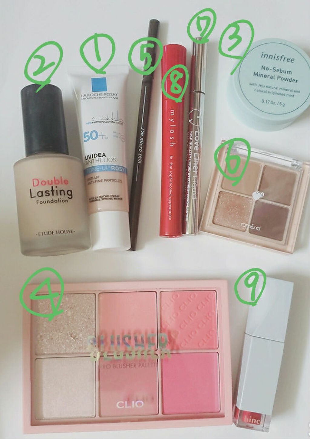 今日のメイクを全部公開します!①ラロッシュポゼ ローズ ポール&ジョーも使いますが、メイクをするときに、顔が保湿さ れているときは、ラロッシュポゼを使います。 ラロッシュポゼはテクスチャーが固めで、 顔がカサカサの状態で塗ると、ポロポロ何かがでてきます😓②エチュード ダブルラスティングファンデーション ニュートラルベージュ 崩れなくて、カバー力があり、お気に入り。コスパも○③イニスフリーのノーセバムミネラルパウダー 皆持ってるよね?粒子が細かくて、サラサラになります。④クリオのチークパレット 最近これしか使ってない。あらゆるピンクが揃っていて買って損 なし!⑤I'MMEMEのアイブローペンシル 断面が楕円形になっていて、細い!使いやすいです。⑥ロムアンドのベターザンアイズ ドライラグラス 粒子が細かくて、深みのあるきれいなグラデーションができま す。ラメがめちゃめちゃかわいい!⑦ラブライナー 色がわかりませんでした。ブラウン系。 アイライナーはリキッド派。色が濃くないので、失敗しにくい。⑧マイラッシュアドバンスド ロングになるし、パンダにもならないし、ダマにもならない!⑨hinceムードエンハンサーリキッドグロウティントtruemoment 使い心地がとても良い。個人的にはロムアンドよりも好き。 色もおしゃれで、良い匂いがする。全く荒れず、しっとり✨以上、長くなりましたが、お付き合いありがとうございました_(..)_