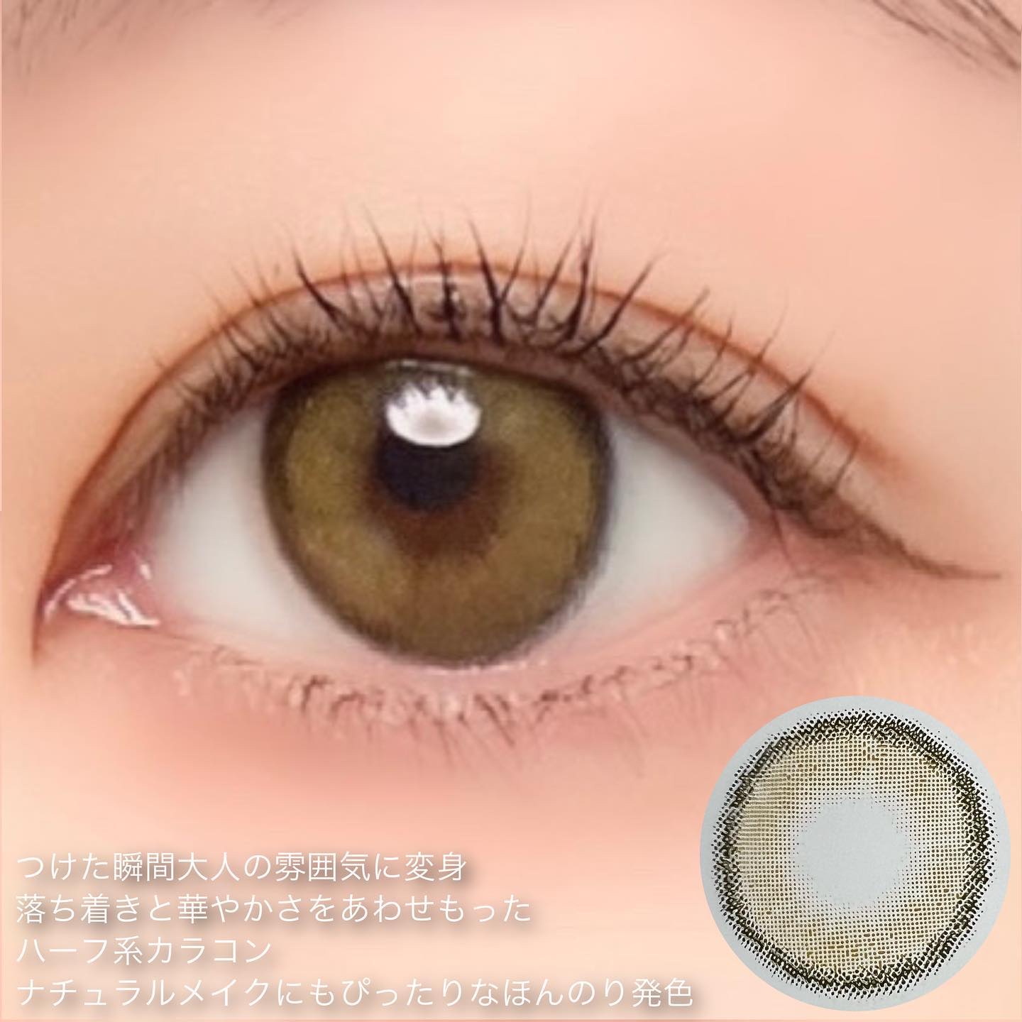 元々ベージュはずっと愛用していたけど、今回の装用カラーはずっと気になっていたオリーブグリーン. 透明感と抜け感があるのにくすみ系の色味なのが本当好き. 細フチとちゅるんとしたデザインなのでナチュラルだし小さめのサイズ感だからリアル色素薄い系の瞳になれます. 発色がいいから黒目でもちゃんと明るくなるし浮かないのがお気に入りです.