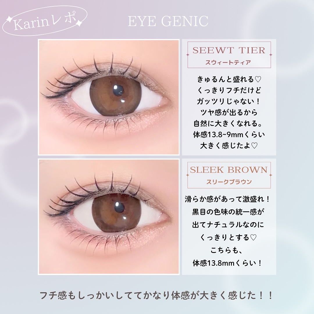アイジェニックのカラコンは全21色で豊富なカラーバリエーション👍🏻 ̖́- ナチュラル系から高発色なものまで幅広いラインナップでほしい色がきっと見つかるし、毎日使える高コスパ1日あたり約27円(税込)🤍 1枚あたりの単価も安くてお財布にも優しい〜〜〜!嬉しい〜〜〜! スウィートティアはダークブラウンフチがちゅるんとした愛らしい雰囲気を演出💭アイジェニック人気ナンバーワンカラー!くっきりはっきりでアイドルみたいなちゅるんeye!盛れるし写真映えする。 スリークブラウンはなめらかで艶のある美しいベーシックブラウン🐻スウィートティアよりチョコレートブラウンっぽいカラーなので柔らかい印象に! どちらも愛され顔になるちゅるんレンズなのでぜひチェックしてみてください♡