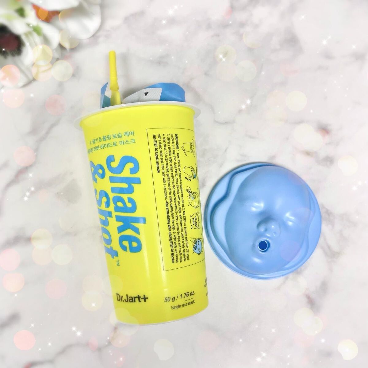Dr.Jart+⋆。˚⋆。˚❁▶︎シェイキングラバーシェイク&ショット《ハイドロショット》 \クセ強パケだけど、期待以上の良さ👶🏻✨/一見ジュースのようなカラフルでかわいいカップを上から覗くと顔がある斬新すぎるパッケージ😳🥤笑ずっと前から気になってたこの子、使ってみました💪〔Dr.Jart+(ドクタージャルト)〕のモデリングマスクをご紹介します🌷ドクタージャルトはシカペアラインが人気だけど、他のシリーズも良いものばかり🫶🏻黄色パケのセラマイディンとかも好き😘こちらのシェイキングラバーはスペシャルケア・集中ケア系のパック等が揃う〝ダーマスクライン〟のモデリングマスクです🌼(時間を置いてぺろーんと剥がすタイプの洗い流さないパック)悩み別の全4種の中、私は黄色×水色のハイドロショットを使用しました💛💙保湿ケアタイプ🙆♀️ヒアルロン酸・ウォーターボタニカルコンプレックスが含まれていてうるおいたっぷりの水光肌に導いてくれます🫧カップに1剤と2剤を入れたら蓋をして口を押さえながらシェイクするとすぐにトロトロのモデリングマスクが完成✨スパチュラも付いていて、1回使い切りだけどこれ1つで完結できるのは簡単で嬉しい💞気持ち厚めにたっぷり顔全体に乗せて15〜20分置いたら剥がして完了🙌弾力のあるシリコンのようなラバー状に固まるので、剥がす時も簡単にペロンと剥がれます💮端などに細かく残ったマスクは拭き取りパッドなどでパッと拭き取ります♩ツヤが生まれてもちもちのしっとり感で満足🥰🫧🫧スペシャルケアにぴったり!コスパは微妙なのでメガ割などお得な機会にまとめ買いがおすすめ。また違う種類も試してみたいです👯♀️ #DrJart#ドクタージャルト#ダーマスクシェイクラバー#シェイキングラバー#シェイクアンドショット#ハイドロショット#スペシャルケア#モデリングマスク#韓国#韓国コスメ#韓国スキンケア#おうち美容#水光肌#うるおいケア#韓国コスメレビュー#ツヤ肌スキンケア