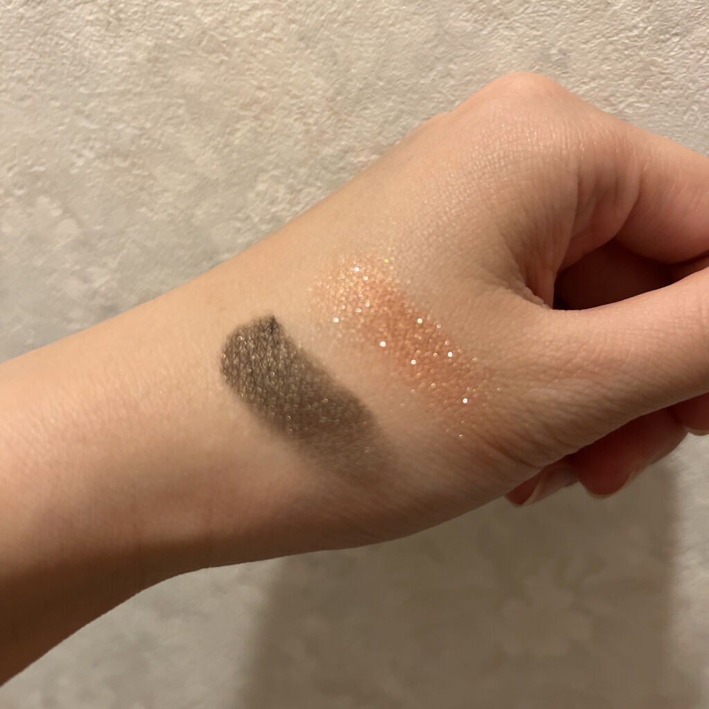 画像の左側が、06番のコンフィデントヌード、右側が04番のエクスプローシヴブラウンです。2枚目に手の甲にのせてみた画像を上げてます。ラメは割と大きめですが、粉質は細かく、まぶたにフィットする感じで、粉飛びはありませんでした。発色はかなり良いで...