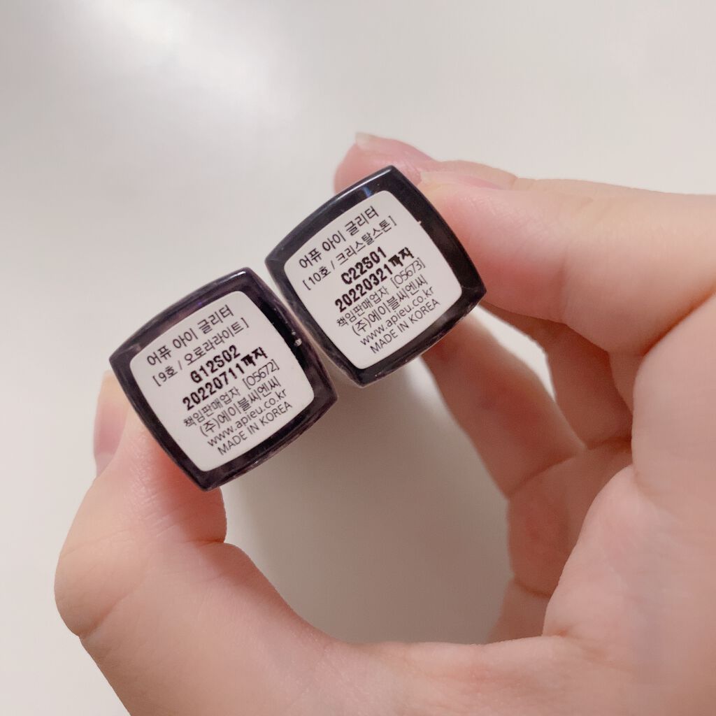 【涙袋生成!!プチプラで買える、A’pieuアイグリッター】こんにちは、meruです☺︎今日紹介したいのはこちら!✨A’pieuアイグリッターAURORALIGHTNo.9✨A’pieuアイグリッターCRYSTALSTONENo.10まず初めに謝らせてください。画像にMISSHAって書いてあるんですが姉妹ブランドのA’pieuの間違いです、、ごめんなさい。✽・:..。o¢o。..:・✽・:..。o¢o。..:・✽・:..。o¢o。..:・こちら、2つで1000円ちょっとで買った気がする、、安い!!色んなアイシャドウグリッターが出ていますが、こちらはコスパがかなり良い方なのではないかと思います。カラー展開も11?13?くらいあって、わたしの購入当初よりもさらに増えました。その中でも今回は涙袋におすすめしたい!変更ホログラムの2色です♡ほぼ色違いに見えますが、ピンクの方が細かいラメも入っていて、密度が高い感じがしました。白の方は中くらいのホログラムが多めで細かいラメは少なめ、って感じです!どちらも時間が経ってもカピカピしないタイプ。一つだけ、最近細い筆のグリッターが増えてる中こちらはチップタイプなのでちょっとアプリケーターが太めです。それ以外は!ほんとすき!!かわいい!!量産系、地雷系メイクにも可愛いと思います♡良かったら参考にしてください!#胸キュンコスメ#グリッター#韓国コスメ#プチプラコスメ