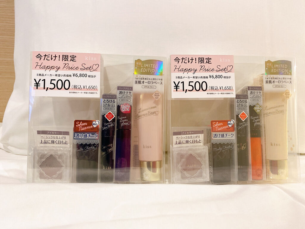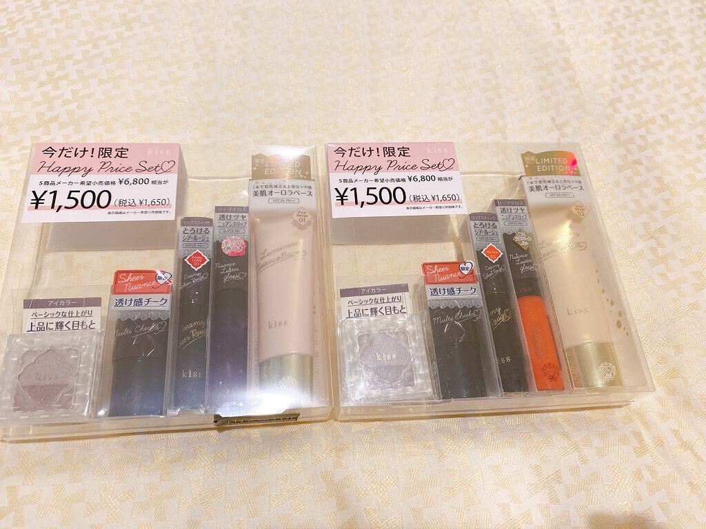 kissスペシャルセット(ハッピープライスセット?)の02番を購入しました!01の方はブルベ向け、02の方はイエベ向けっぽかったです。ちなみに私はアインズトルペで購入しました。5点6800円相当が1500円です。以下、中身詳細です。①ルミナス...
