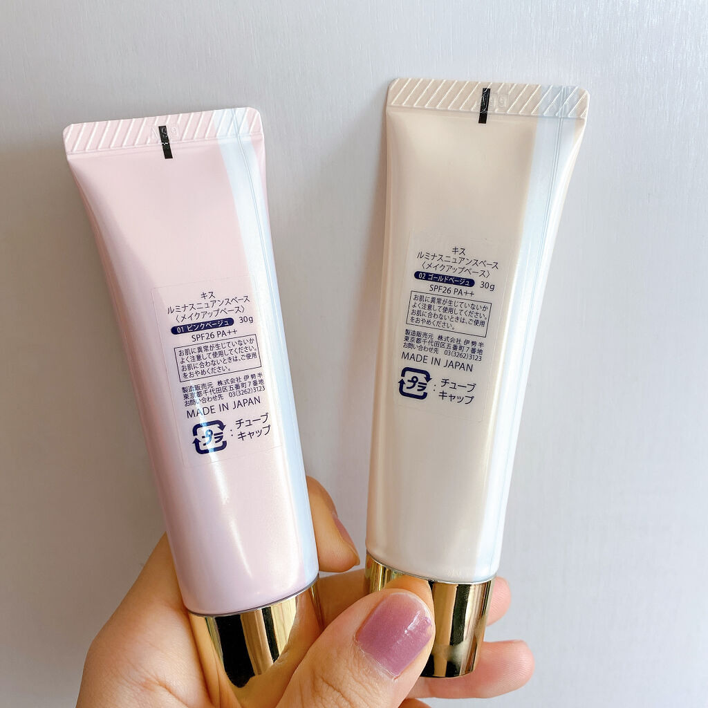 kissルミナスニュアンスベース01ピンクベージュ 30gこちらはロフトで購入したkissの福袋のような詰め合わせ?に入っていました!まずはパッケージを見て下さい!こちらのシリーズはかわいいパステルカラーのパッケージになってます!キャップもゴールドで全体的にEleganceみたいな綺麗なデザインで気分が上がります。可愛くて飾っておきたいコスメでもあります中身のベースについてですが、SPF26PA++と日焼け止め効果もしっかりありますこちらのベースは紫よりのピンクで、ツヤ感を出してくれるのでハイライトはあまり必要ないと思います!あとは肌が乾燥しないのがいいところだと思います!つっぱり感もないのでさらっと塗れていいと思います!#kiss20214