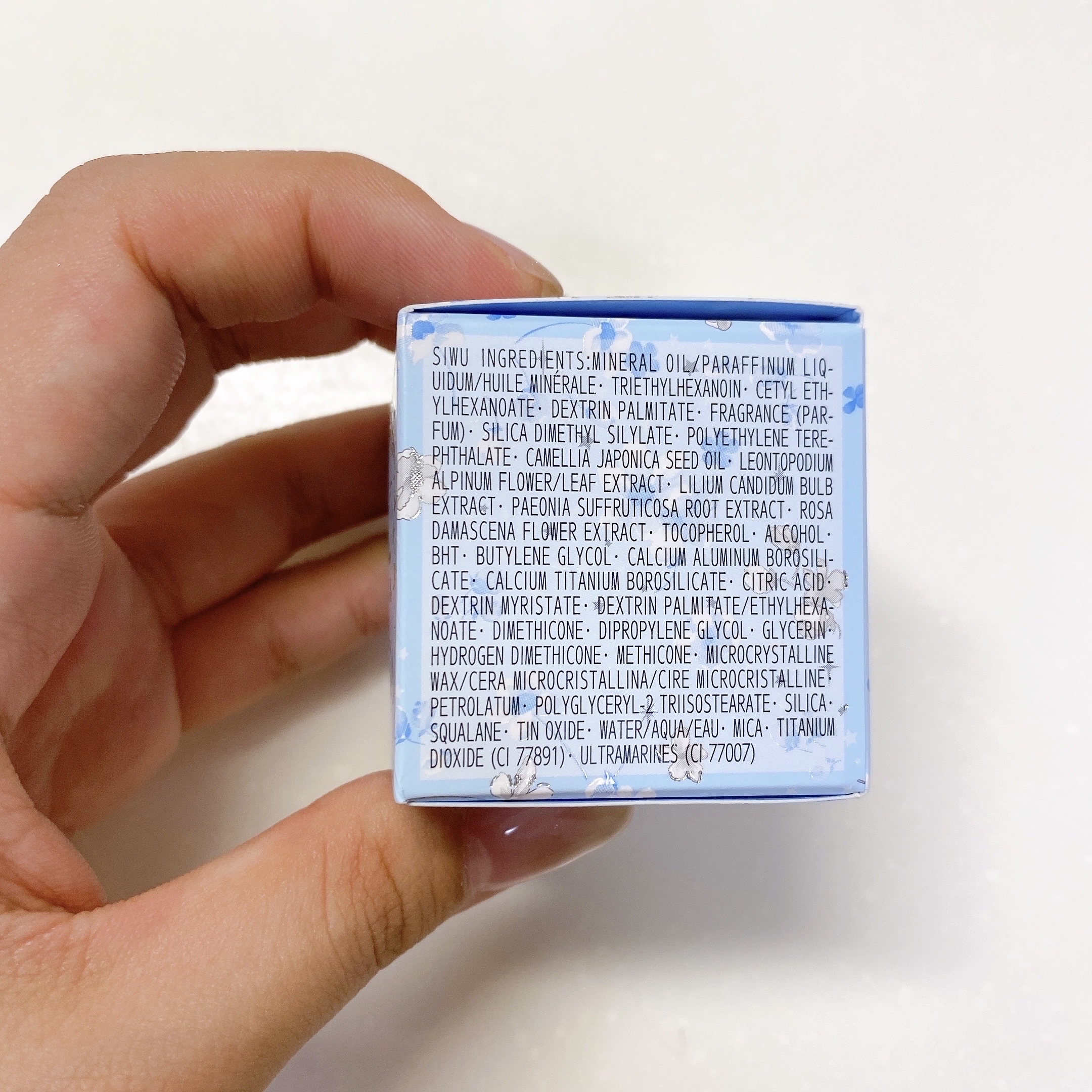 - 水、BG、合成金雲母、ホウケイ酸(Ca/Al)、ポリ酢酸ビニル、タルク、シャクヤク花エキス、ダマスクバラ花エキス、ホホバ種子油、マドンナリリー根エキス、DPG、EDTA-2Na、TEA、エタノール、シリカ、ジェランガム、ジメチコン、セスキオレイン酸ソルビタン、トリセテアレス-4リン酸、パーフルオロヘキシルエチルトリエトキシシラン、ブチルポリジメチルシロキシエトキシプロピルリン酸、ポリソルベート80、ポリビニルアルコール、リン酸、レシチン、酸化スズ、水酸化Al、メチルパラベン、香料、(PET/ポリメタクリル酸メチル)ラミネート、グンジョウ、マイカ、酸化チタン、酸化鉄