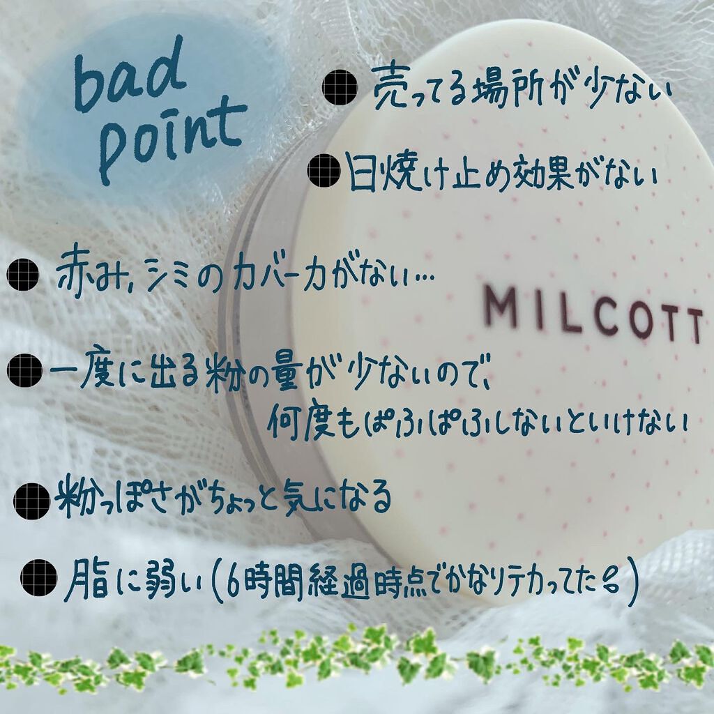 ほんのり綺麗な素肌感/【MILCOTTスキンブラーパウダー】今回紹介するのは、MILCOTTのスキンブラーパウダーです!韓国発の隠れた名ブランド☺️シンプル可愛いパケが目を引きますよね𓂃◌𓈒𓐍文章もぜひご覧ください🌱┈┈┈┈┈┈┈┈┈┈┈┈┈┈┈┈┈┈┈┈こんにちは、コーヒー屋さんです☕️閲覧ありがとうございます☺️(かっこの中はコスメオタクの副音声です👀)本日もごゆっくりレビューご覧ください🤍┈┈┈┈┈┈┈┈┈┈┈┈┈┈┈┈┈┈┈┈☁️☁️☁️☁️☁️☁️☁️☁️☁️☁️☁️☁️☁️☁️┈┈┈┈┈┈┈┈┈┈┈┈┈┈┈┈┈┈┈┈【MILCOTTスキンブラーパウダー(ホワイト)】☁️商品のスペック☁️価格:約1000円(安いところでは600円くらいでGETできることもあるみたいです☺️私は近所の半額ショップ👀で購入しました笑)内容量:5g(1gあたり100〜200円)※Innisfreeのノーセバムミネラルパウダーも同じ5gです!色展開:01 WHITE(ホワイトパウダー)02PINK(ピンクパウダー)SPFやPAの表記はないので、おそらく日焼け止め効果はついていないと思います。┈┈┈┈┈┈┈┈┈┈┈┈┈┈┈┈┈┈┈┈🔴good👌point🔴・素肌がそのままランクアップしたかのような仕上がり。(少し艶が出るセミマットな仕上がり。どんな下地やファンデとも合う!)・ピンクのパフがかわいい💕汚れも目立ちにくい。(ファンデ汚れが気にならない!粉が白なのでどのくらい粉がついているかも分かりやすい。)・持ち歩きやすいサイズ感。持ち歩いてもこぼれたりしない!(コンパクト!蓋をきっちりしめればこぼれない!)・トーンアップ加減が絶妙で白浮きはしないけど透明感アップ☺️(白いパウダーって顔と首の色が変わるくらい白くなっちゃうものも多いんですが、これは透明に近いので浮かないです!)・毛穴カバーはかなりできる!(小さな毛穴だったらぼかして見えづらくしてくれる🍰)・崩れ方は汚くない!(濃い色がついていないので、崩れても目立たない!)・嫌な匂いがしない(無臭です😷)┈┈┈┈┈┈┈┈┈┈┈┈┈┈┈┈┈┈┈┈🔵bad✋point🔵・売っている場所が少ない(ほんとに少ない…!ドンキかディスカウントショップ、またはネットで購入するしかないみたいです。Amazonや楽天にはまだありました😉)・日焼け止め効果がない(む〜〜個人的にはSPFとPAが欲しい…)・赤みやシミのカバー力は全くない😣(色が付いていないので仕方ない…)・一度に出る粉の量が少なめなので、パフでつける際は何度もぱふぱふしないといけない…(小さめのブラシにとって使うのがおすすめ!)・粉っぽさが少〜し感じられる(イニスフリーより粒子がちょっと粗めです)・6時間経過時点でTゾーンは普通にテカってる…(脂には弱い印象。混合肌の私はUゾーンに使って丁度よかったです😌)┈┈┈┈┈┈┈┈┈┈┈┈┈┈┈┈┈┈┈┈🟡こんな人におすすめ・素肌感のあるメイクが好きな人・肌悩みが少ない人or高カバーの下地やファンデを使っている人(ニキビや赤み、シミは隠せないので…。逆に高カバーのリキッドと合わせると仕上がりを邪魔しないので◎)・毎日遠慮なくパウダーを使いたい人(500円前後でget出来た人は惜しみなく毎日使えますよね!)・スクールメイクに使いたい人・かわいいパケのパウダーを持ち歩きたい人for乾燥肌さん ★★★☆☆(Tゾーンを中心に優しくつける)for脂性肌さん ★★☆☆☆(Uゾーンを中心にしっかりつける)for混合肌さん ★★★☆☆(Uゾーンを中心につける)┈┈┈┈┈┈┈┈┈┈┈┈┈┈┈┈┈┈┈┈総合評価は70点です💡良くも悪くも、これといった特徴がないパウダーだな…と感じました。正直、可もなく不可もなくかな…。。逆にメイク初心者さんや自分の肌タイプがわからない方には、「基準となるパウダー」としておすすめしたい!!また、素肌感のあるメイクにももってこいです☺️気になる方はぜひチェックしてみてくださいね!最後まで読んでくださった方、本当にありがとうございました🥲またお会いできますように!┈┈┈┈┈┈┈┈┈┈┈┈┈┈┈┈┈┈┈┈#フェイスパウダー#プチプラコスメ#コスメレビュー#プチプラコスメレビュー#韓国コスメレビュー#韓国コスメ#韓国フェイスパウダー#cosmetic#cosmeticreview#スクールメイク#ナチュラルメイク#ベースメイク#ナチュラルベースメイク#メイク#おしろい#プチプラベースメイク#毎日メイク#冬メイク#コスメ紹介#コスメオタク#コスメ正直レビュー#毛穴#ガチレビュー