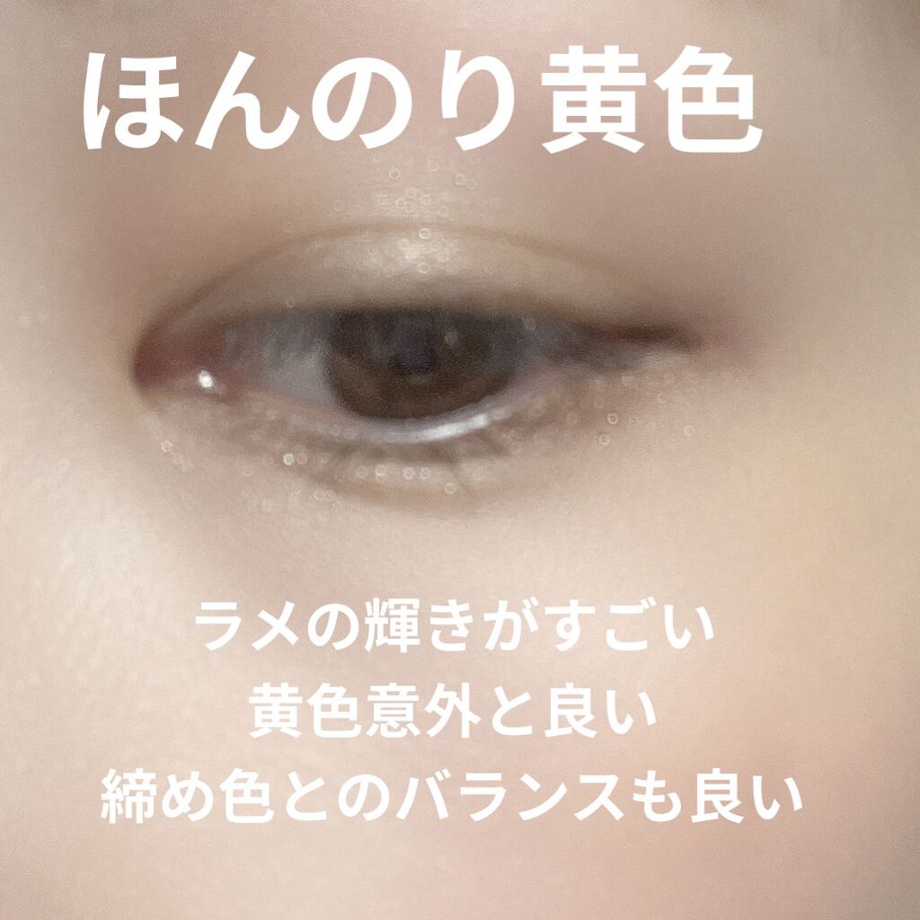 このシリーズの特徴な気がしますが、ラメの輝きがすごいです!キレイに光ります!きらめきます!! ラメ好きとしては大変よい。 黄色は結構馴染むし変に浮くこともなく良い感じだな〜と思いました。 下のふたつの色(茶色っぽいのとグレーまじりの茶色っぽいやつ)も結構良い。キレイに締めてくれました。 左上のハイライトっぽいやつがすごい輝きます。涙袋にがっつり入れました。 他の色も買ってしまいそうだな〜さすが資生堂という気持ちです。
