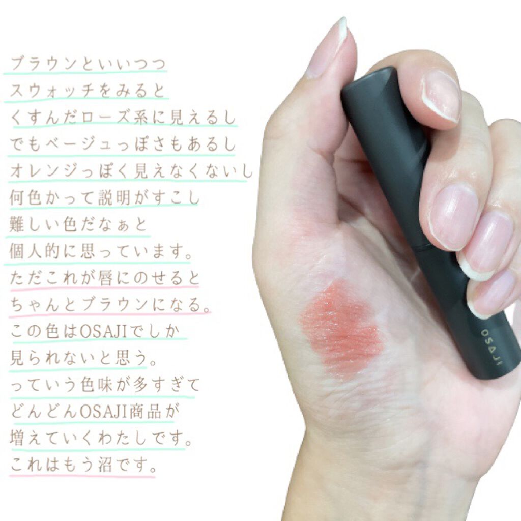 ▼絶妙な色味と艶でお洒落になれるこんにちは!OSAJIのニュアンスリップスティック05Kokorozashi〈志〉のレビューです。どの色も素敵で半月くらい迷ってこのKokorozashi〈志〉を選んだのですがブラウンすぎないブラウンリップで一気にこなれ感が出せるのでお気に入りです。とはいえブラウンすぎないブラウンなので茶色じゃないじゃん!!って人も出てきてしまうような色かも。と思っている。まぁでもヌーディーブラウンなのでOSAJIの考えるヌーディーブラウンはこういう解釈なんだなと思ってます。(OSAJI全肯定bot)艶感の出るリップなのでマスクにはしっかりついちゃいますがかわいいから仕方ない!もう早くマスクのことを何も考えずにリップを楽しめるようになりたいです。#osaji#オサジ#ニュアンスリップスティック#デパコス#一生貢ぎたい神コスメ