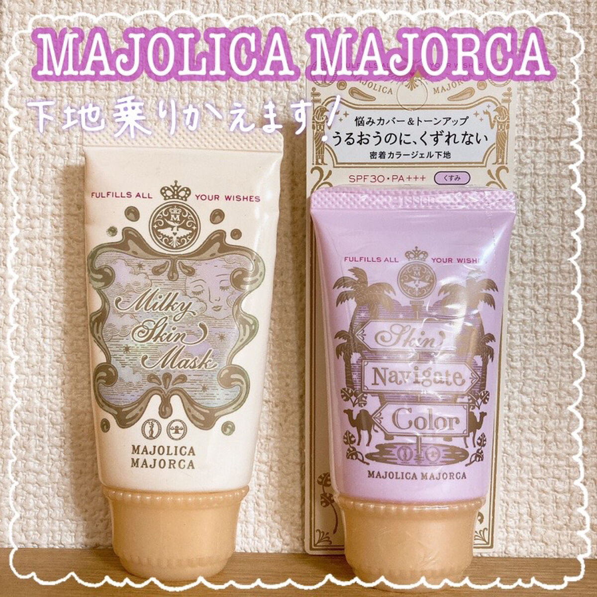 MAJOLICAMAJORCAミルキースキンマスクパープルです!塗ってみると水っぽい感じでサッパリします!匂いが少し独特です。ほんとにワントーンアップって感じです!!!スキンミルク美容液マスク化粧下地の3つって楽でありがたいし、可愛いですよね...