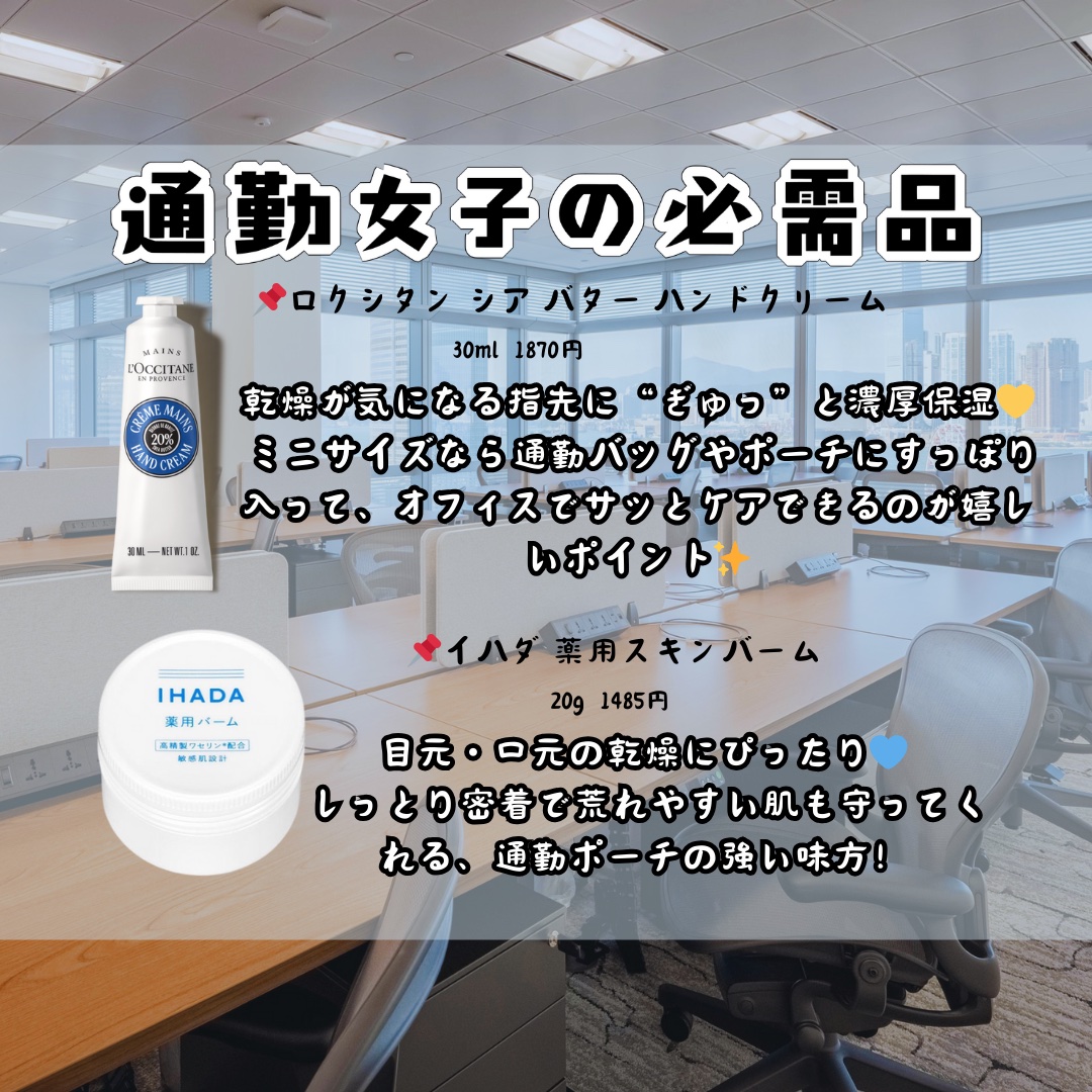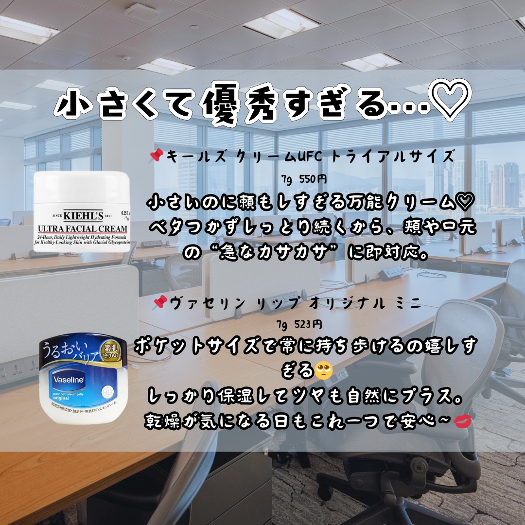 💧乾燥オフィス、辛くない?これでサッと解決👇💦アベンヌウオーターミニ→メイクの上からシュッ✨🧴無印携帯用乳液→デスクでサッと保湿💛🌿キールズクリームUFC→頬・口元のカサつきに👍💋ヴァセリンリップ→唇ふっくら♡🖐️ロクシタンシアバター→手荒れ...