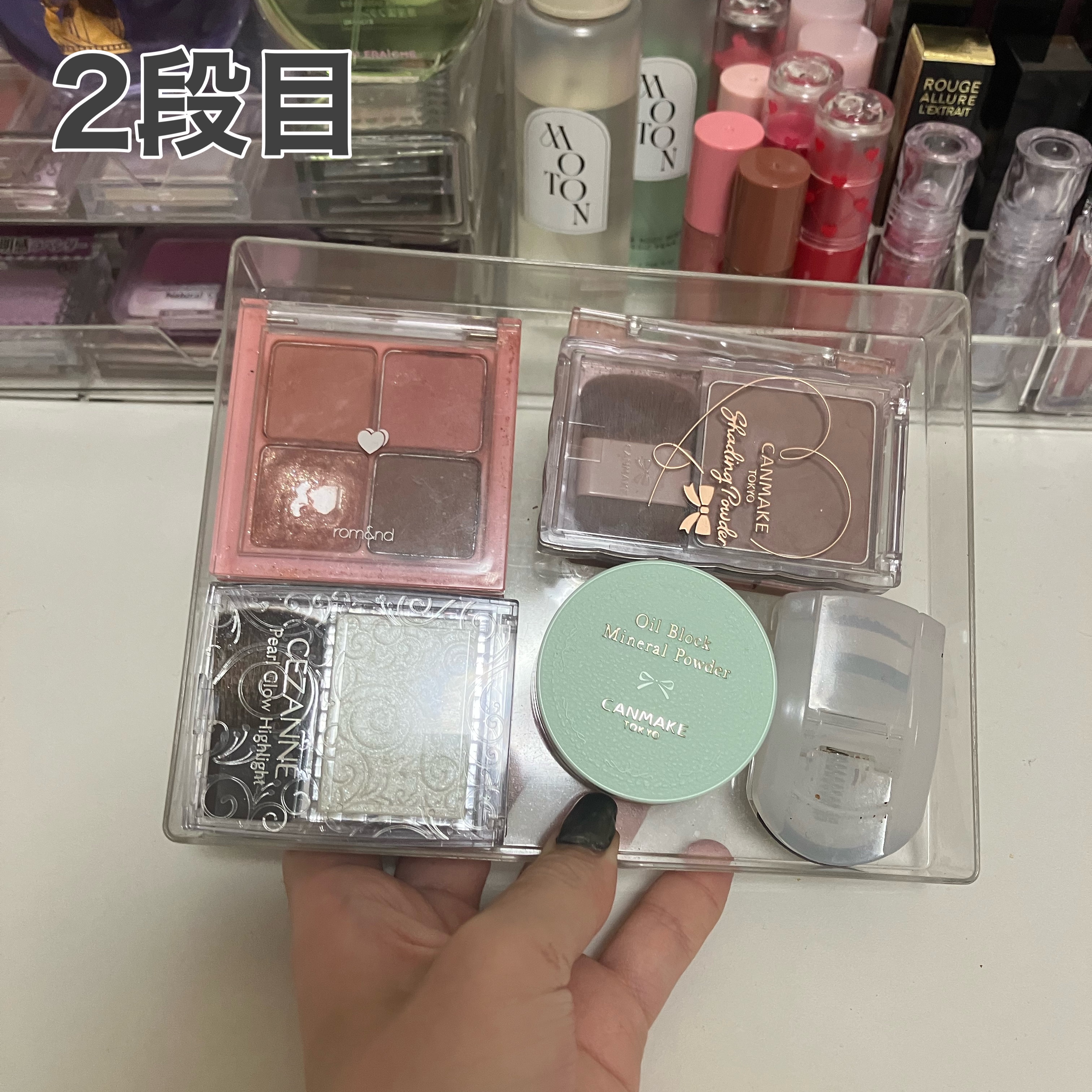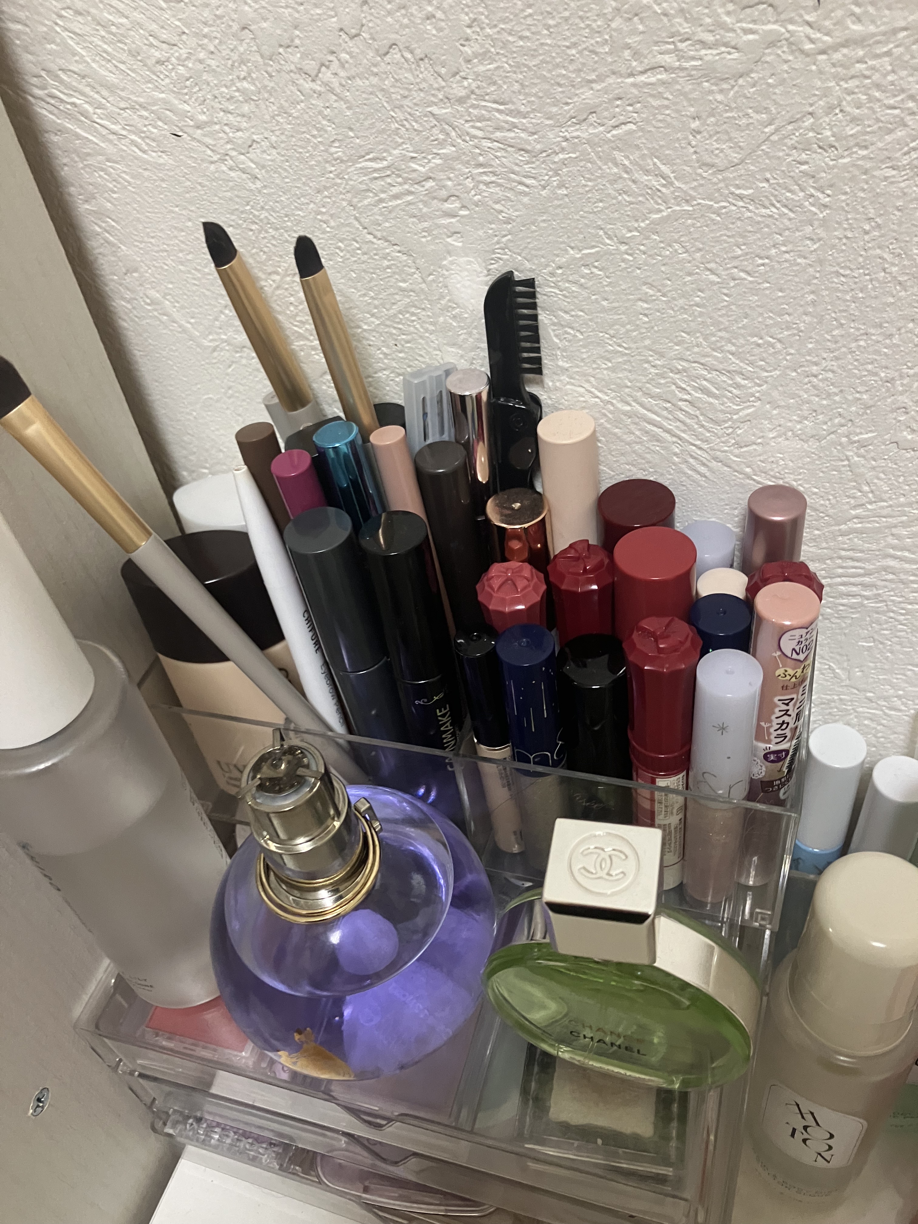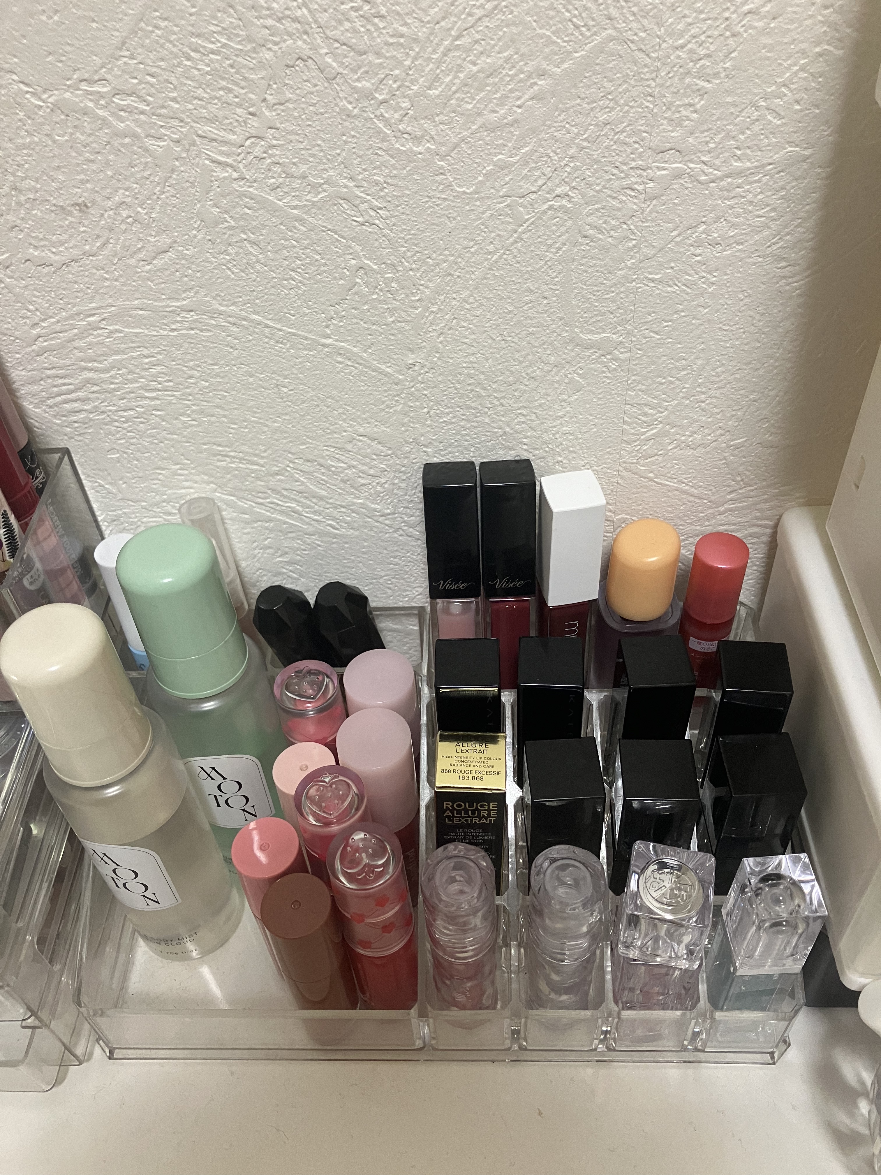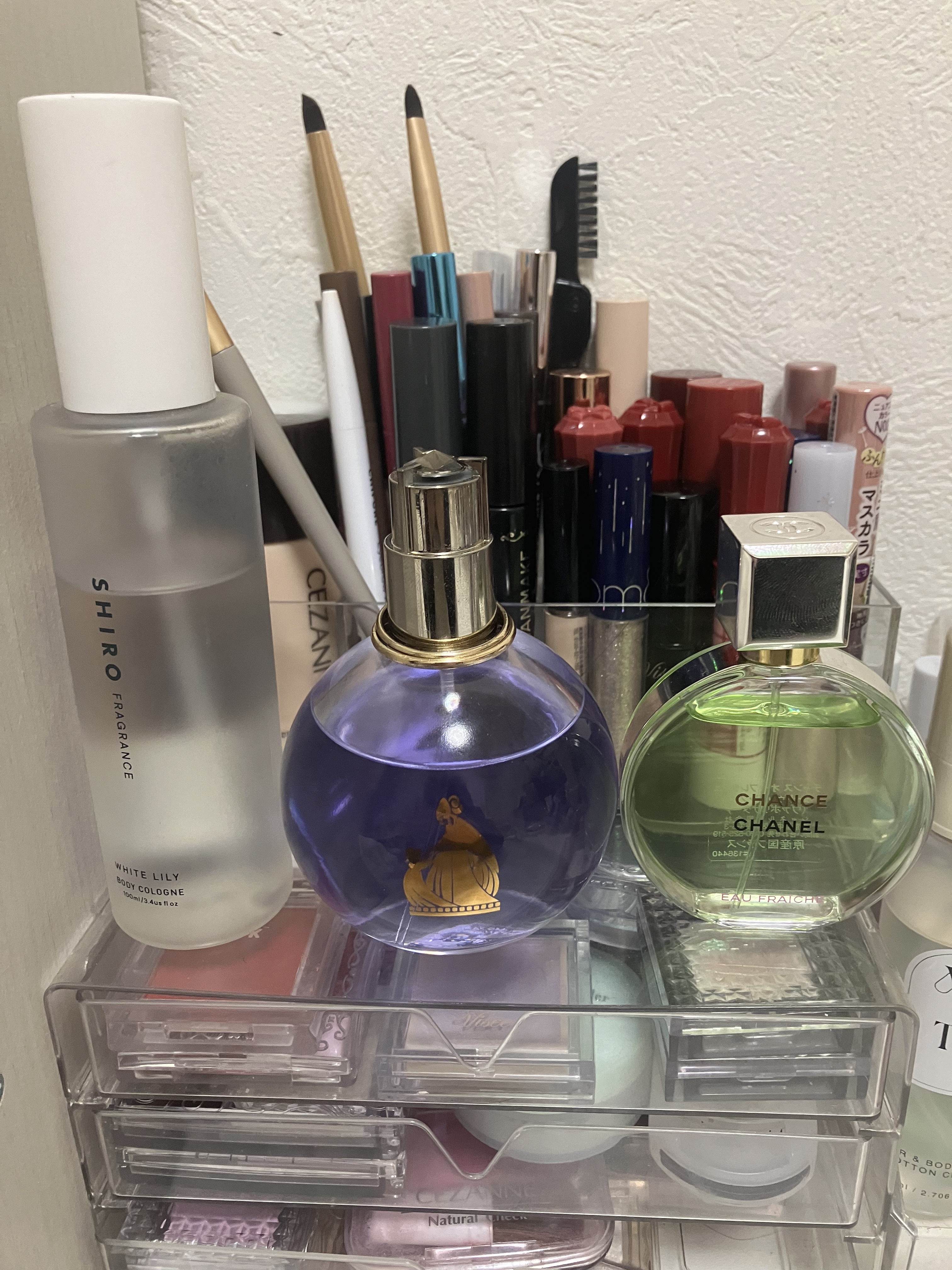 最初の3段クリアケース 下地、アイライナーを立ててるケース ロールオン香水を入れてある小さい入れ物 ウルリスのヘアスティックなどを入れてる入れ物 →ダイソー リップを立ててるクリアケース カラコン等を入れてるケース →スリコ(多分もう売ってないかも🥲) ディフューザーが置いてある白い入れ物 チップ、二重テープが入ってる黒い半透明ケース →セリア