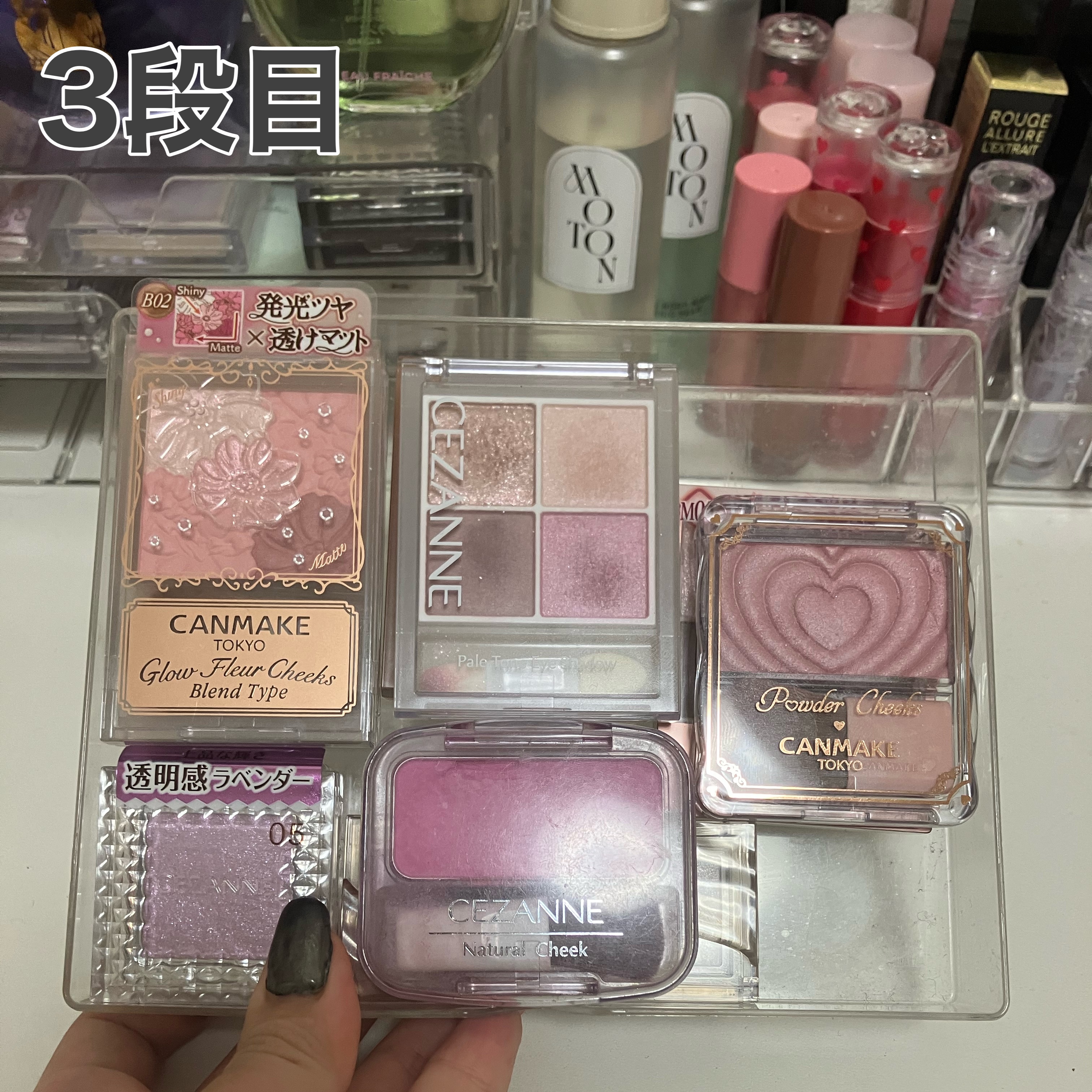 最初の3段クリアケース下地、アイライナーを立ててるケースロールオン香水を入れてある小さい入れ物ウルリスのヘアスティックなどを入れてる入れ物→ダイソーリップを立ててるクリアケースカラコン等を入れてるケース→スリコ(多分もう売ってないかも🥲)ディフューザーが置いてある白い入れ物チップ、二重テープが入ってる黒い半透明ケース→セリアヘアオイル、スプレー、化粧水が入っている入れ物→無印良品コスメが増えてきて容量オーバーだから収納を増やしたいけどいい案が思いつかない、、アドバイスあったらコメントお願いします!#コスメ収納コンテスト#映えコスメ#コスメ収納#新作コスメ#セルフネイル#お気に入り#プチプラ#デパコス#ピンクメイク#アイメイク#アイシャドウパレット#ボディケア#ティント#セラム