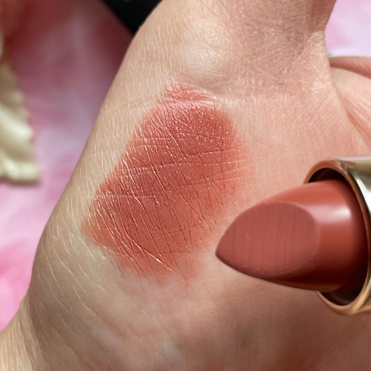 人塗りで高発色、高級なサテンのようなセミマットな質感。 ベージュ系って何度も塗らないと色が乗らなかったりするけどこれはささっと塗るだけできちんとベージュが乗る◎ やや乾燥が気になるので保湿してティッシュオフ後に使うのがおすすめ😊 肌馴染みの良いやや黄み寄りのコーラルベージュなのでイエベさんにおすすめ◎ オフィスやお出かけ幅広いシーンに😌