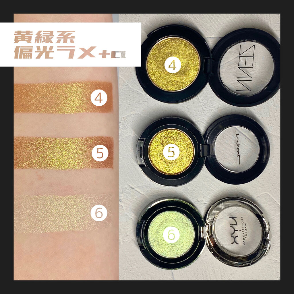 🌫🌫🌫🌫🌫🌫個人的感想含む備忘録🌫🌫🌫🌫🌫🌫🌫室内光で撮影🌫画像の色味調整有り🌫アイシャドウベース無し🌫二〜三度重ね塗り🌫画像2枚目🌫ブラウンベース青緑系偏光パール❶NYXPS13(ブードゥー) ・ベースの色味 黄茶◻︎◼︎◻︎◻︎◻︎赤茶 ・パールの色味 緑◼︎◻︎◻︎◻︎◻︎青 ・パールの粒径 小◼︎◻︎◻︎◻︎◻︎大 ・色もち ◼︎◼︎◼︎◼︎◻︎ ・コスパ ◼︎◼︎◼︎◼︎◼︎(¥700+tax) ≡MEMO≡日本ではもう購入できない。単体で見ると派手だが、オレンジブラウンがベースなので目蓋にのせると意外と馴染む。リピ2個目。❷iroasobiIR4E-04(人生を楽しんで) ・ベースの色味 黄茶◻︎◻︎◼︎◻︎◻︎赤茶 ・パールの色味 緑◻︎◼︎◻︎◻︎◻︎青 ・パールの粒径 小◼︎◻︎◻︎◻︎◻︎大 ・色もち ◼︎◼︎◼︎◻︎◻︎ ・コスパ ◼︎◼︎◼︎◼︎◼︎(¥1,400+tax) ≡MEMO≡4色中3色がそれぞれ違う色味・ニュアンスの偏光パール。偏光好きならひとつ持っておいて損はない程、使い勝手の良いパレット。価格も安いので、偏光アイシャドウデビューにもオススメ。❸M•A•Cブルーブラウン ・ベースの色味 黄茶◻︎◻︎◻︎◻︎◼︎赤茶 ・パールの色味 緑◻︎◻︎◻︎◻︎◼︎青 ・パールの粒径 小◻︎◼︎◻︎◻︎◻︎大 ・色もち ◼︎◼︎◼︎◼︎◻︎ ・コスパ ◼︎◼︎◼︎◼︎◻︎(¥1,500+tax) ≡MEMO≡写真では大きい方のピグメントだが、現在日本で入手できるのはMINIM•A•C(¥1,500+tax)の方のみ?ルースパウダー状なので慣れるまでは扱いづらいが、全く量が減らないのでコスパが良い。🌫画像4枚目🌫黄緑系偏光ラメ&偏光パール❹ZENN.THZ505 ・ベースの色味 透明◻︎◻︎◼︎◻︎◻︎橙 ・ラメの色味 黄◻︎◻︎◻︎◼︎◻︎緑 ・ラメの粒径 小◻︎◻︎◼︎◻︎◻︎大 ・色もち ◼︎◼︎◼︎◻︎◻︎ ・コスパ ◼︎◼︎◼︎◻︎◻︎(¥1,200+tax) ≡MEMO≡アイシャドウ自体の見た目ほど、緑色のラメは強く発色しない。オレンジベースで意外と使いやすいが、多少のラメ落ちがあるのでアイシャドウベースを使用した方が良い。❺M•A•Cアイライク2ウォッチ ・ベースの色味 透明◻︎◼︎◻︎◻︎◻︎茶 ・ラメの色味 黄◻︎◻︎◼︎◻︎◻︎緑 ・ラメの粒径 小◻︎◻︎◻︎◼︎◻︎大 ・色もち ◼︎◻︎◻︎◻︎◻︎ ・コスパ ◼︎◻︎◻︎◻︎◻︎(¥2,900+tax) ≡MEMO≡偏光ラメがザクザクでベース色は薄いので、単色使いよりはトッピングに向いている。結構ラメ落ちするので、ベースは必須。❻NYXPS20(グラススリッパ) ・ベースの色味 無色◼︎◻︎◻︎◻︎◻︎白 ・パールの色味 黄◻︎◻︎◻︎◻︎◼︎緑 ・パールの粒径 小◼︎◻︎◻︎◻︎◻︎大 ・色もち ◼︎◼︎◼︎◻︎◻︎ ・コスパ ◼︎◼︎◼︎◼︎◼︎(¥700+tax) ≡MEMO≡日本ではもう手に入らない。単体だと薄い乳白色のベースに緑系の偏光パールがとても綺麗なアイシャドウ。他のアイシャドウに重ねると、どんなものでも自分好みの偏光アイシャドウにできる。一番のお気に入り。🌫画像6枚目🌫❻偏光パール +マットシャドウ ・Fujikoミニエアリーディップパウダー03 ・ロレアルパリオイルシャドウ02 ・M•A•CスモールアイシャドウBROWNSCRIPT#NYX#iroasobi#MAC#ZENN