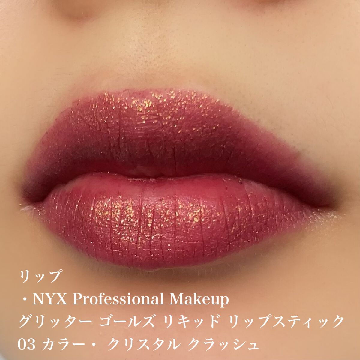 ラメ好き必見♡2枚目に唇に乗せた写真あります!フラッシュで撮りました!!肉眼で見ると、電気の角度とかでキラキラッとしてとっても可愛いです♡常にギラギラとかじゃないので普段使いもできます!!ラメだいすきな私のお気に入りです♡色は深い赤で、ゴールドのラメがたくさん入っています!nyxグリッターゴールズリキッドリップスティック03カラー・クリスタルクラッシュnyxは少し前まで日本にも店舗ありましたが撤退してしまっています。ですが、Qoo10にありましたよ!!NYXProfessionalMakeup