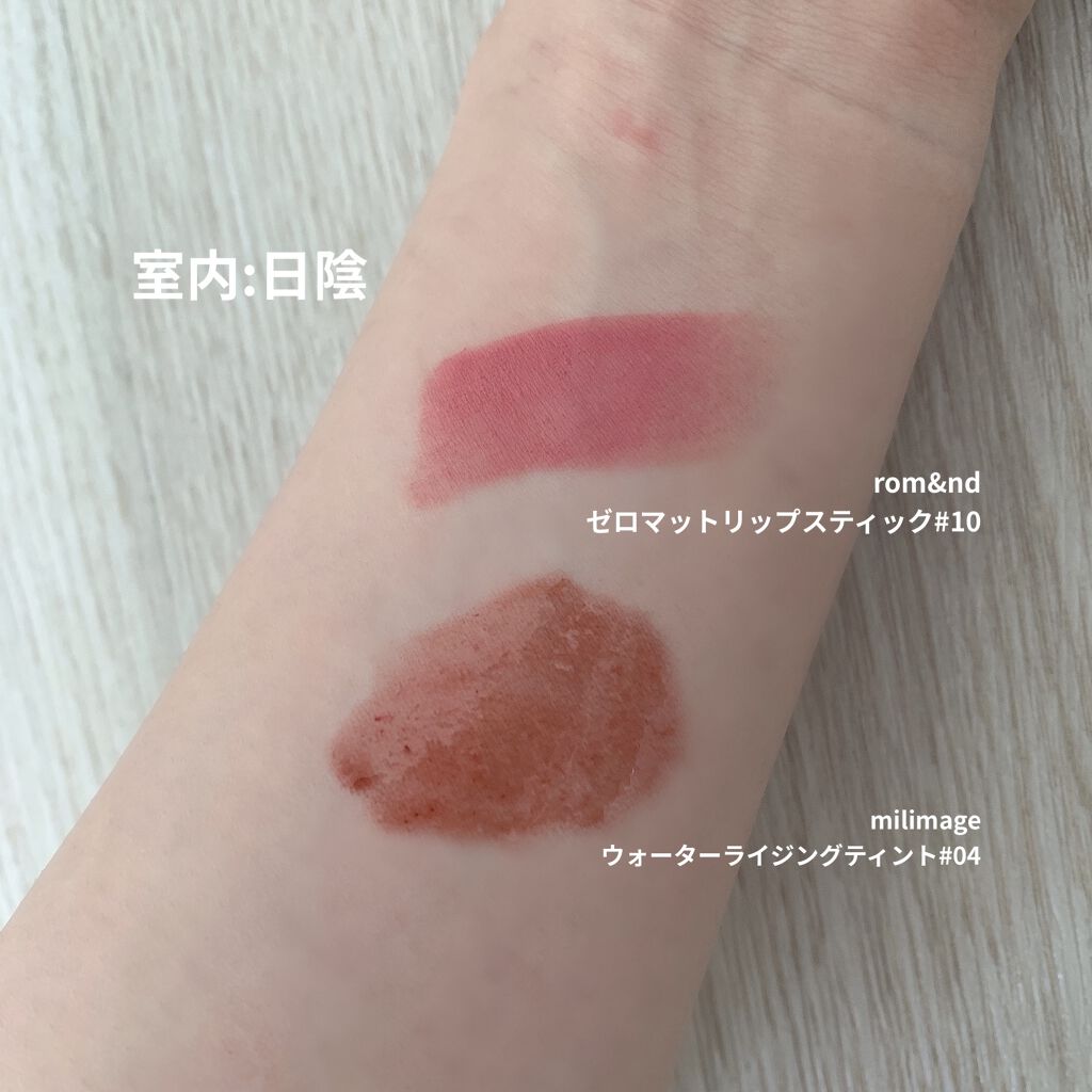 [rom&nd]ゼロマットリップスティック#10[milimage]ウォーターライジングティント#04リップに迷った時はとりあえずコレ!なデイリーリップをご紹介します。どちらのお色も本当に使いやすいので一本持ってても損はないかと思います🌼①rom&ndゼロマットリップスティック#10こちらに詳細と他のカラーも載せてます!ご参考にどうぞ▽(https://lipscosme.com/posts/3084139)[感想]私が買った2色↑とも使いやすいけど、最近お気に入りはpinksand!本当に上品な発色してくれて、いっきに大人顔にしてくれる。薄い色のリップて、なんかいつも物足りなさを感じて、遠ざけてたけどこれはそれが無い。色持ちもよし。②MILIMAGEウォーターライジングティント#04[感想]これはイエベさんもブルベさんもいける色なのでは?と個人的に思ってます!くすみドライローズって感じで、粘膜リップぽい。すんごく使いやすくて、一時期これしか使ってなかった🌼時間が経つとつけたてよりピンクみが若干増してくるけど、それも変なピンクじゃなくて血色感が出てきたという感じでお気に入り。職場でもデートでもお出かけでも何でももってこいな万能カラーです💕ちなみにウォーターライジングティントの色違いはこちらでレポしてます▽(https://lipscosme.com/posts/3108964)↑のワイルドベリーに比べると色残りはこっちの色のが若干劣るけど、私は許容範囲かなという感じです!_____________________________________いつも、イイネ&フォローありがとうございます♡とても励みになります!よかったらInstagramも覗きにきてください🍒[🔍airi95time]_____________________________________#rom&nd#ゼロマットリップスティック#milimage#ウォーターライジングティント#ヌディテンダーローズ#PINKSAND#デイリーリップ#韓国コスメ