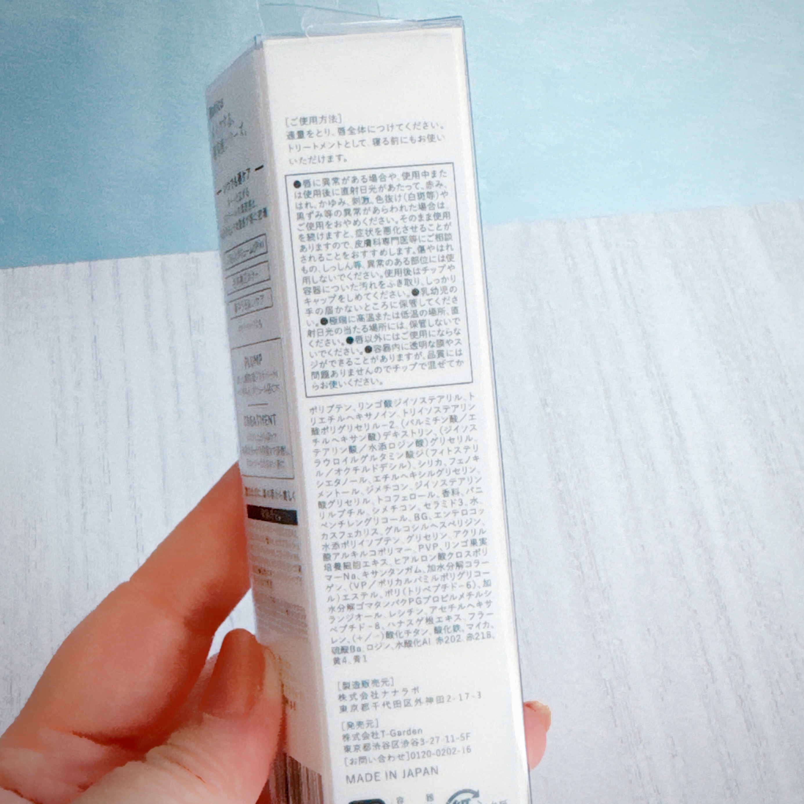 - ポリブテン、リンゴ酸ジイソステアリル、トリエチルヘキサノイン、トリイソステアリン酸ポリグリセリル-2、(パルミチン酸/エチルヘキサン酸)デキストリン、(ジイソステアリン酸/水添ロジン酸)グリセリル、ラウロイルグルタミン酸ジ(フィトステリル/オクチルドデシル)、シリカ、フェノキシエタノール、エチルヘキシルグリセリン、メントール、ジメチコン、ジイソステアリン酸グリセリル、トコフェロール、香料、バニリルブチル、シメチコン、セラミド3、水、BG、ペンチレングリコール、エンテロコッカスフェカリス、グルコシルヘスペリジン、水添ポリイソブテン、グリセリン、アクリル酸アルキルコポリマー、PVP、リンゴ果実培養細胞エキス、ヒアルロン酸クロスポリマーNa、キサンタンガム、加水分解コラーゲン、(VP/ポリカルバミルポリグリコール)エステル、ポリ(トリペプチド-6)、塩化Na、加水分解ゴマタンパクPGプロピルメチルシランジオール、レシチン、アセチルヘキサペプチド-8、ハナスゲ根エキス、フラーレン、酸化チタン、酸化鉄、マイカ、硫酸Ba、ロジン、水酸化Al、赤202、赤218、黄4、青1