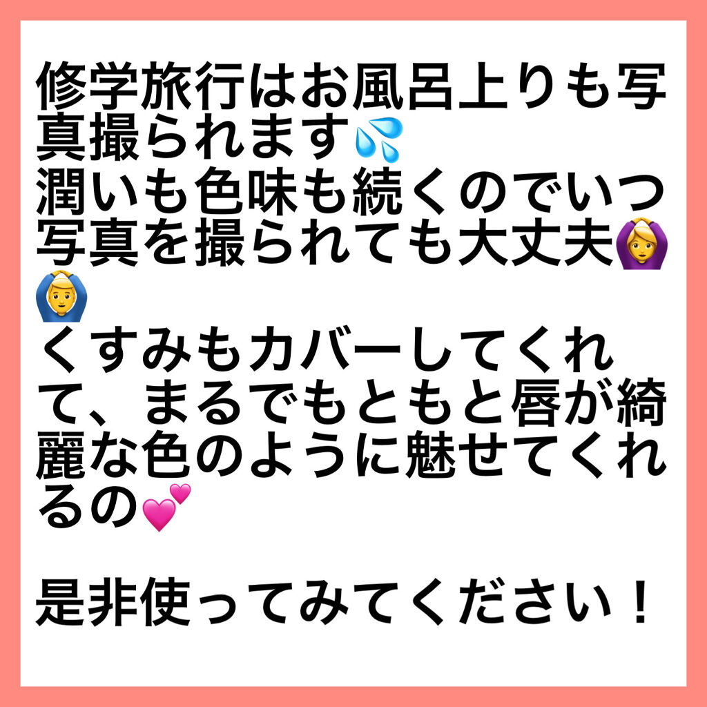 ほんとに素肌を生かすと謳ってる通りなのでかなりティント薄めですがキレイな優しいカラーが続くのでちょっと乾燥してるときや学生さんなんかにオススメ🙆🏻♀️💓 私の場合常に唇カサカサなので水分を拾えずほとんど色づかなかったみたい😭 けどほんのり分かるのでマスクしてて使う分にぴったりかも❤️ すっぴん風リップなので夜とかでも使えるし結果買ってよかった✨