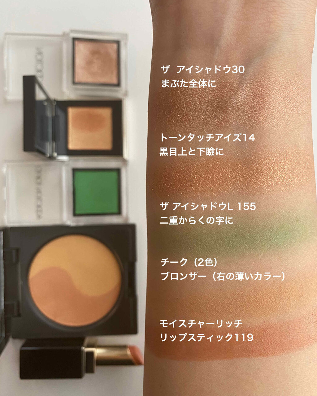⚑⚐2020.8.4・大好きなグリーン✖️ベージュでメイク✨・・派手そうに見えるパキッとしたグリーンですが、意外と使いやすいのでカラーメイク初心者さんでも楽しめそうなアイシャドウです💚・・今日はベージュでまとめましたが、パール感のあるブラウンやブロンズカラーと合わせたら秋っぽいメイクになりそう🍂・・・☑︎アイシャドウ#アディクション#ザアイシャドウ30リゴレット👉まぶた全体眉下まで・#ザアイシャドウL155NewForest👉上瞼の際に少し濃い目のせてから二重にぼかす👉目尻にも・#suqqu#トーンタッチアイズ14炎華👉黒目の上と下瞼に・・☑︎チーク・ブロンザー#celvoke#カムフィーブラッシュ07bキャメルブラウン👉チークとして(左を先に右をあとから)👉右のカラーをブロンザーとしてほんのり日焼け肌カラーに✨・・☑︎リップ#スック#モイスチャーリッチリップスティック119夕凪・・・毎日使いたいカラーがありすぎてどんなメイクをしようかソワソワしてしまいます😂😂・・・当面(たぶん)は今あるもので色々な組み合わせを楽しみたいと思います☺️・・・#今日のメイク#今日のコスメ#メイクアイテム#コスメ好きさんと繋がりたい#メイク好きさんと繋がりたい#アラフォーメイク#大人メイク#やりすぎないメイク#アイシャドウ#ザアイシャドウ#ザアイシャドウl#トーンタッチアイズ#セルヴォーク#カムフィーブラッシュ#モイスチャーリッチリップスティック#ベージュリップ#グリーンメイク#緑メイク#おすすめリップ#おすすめチーク#おすすめコスメ
