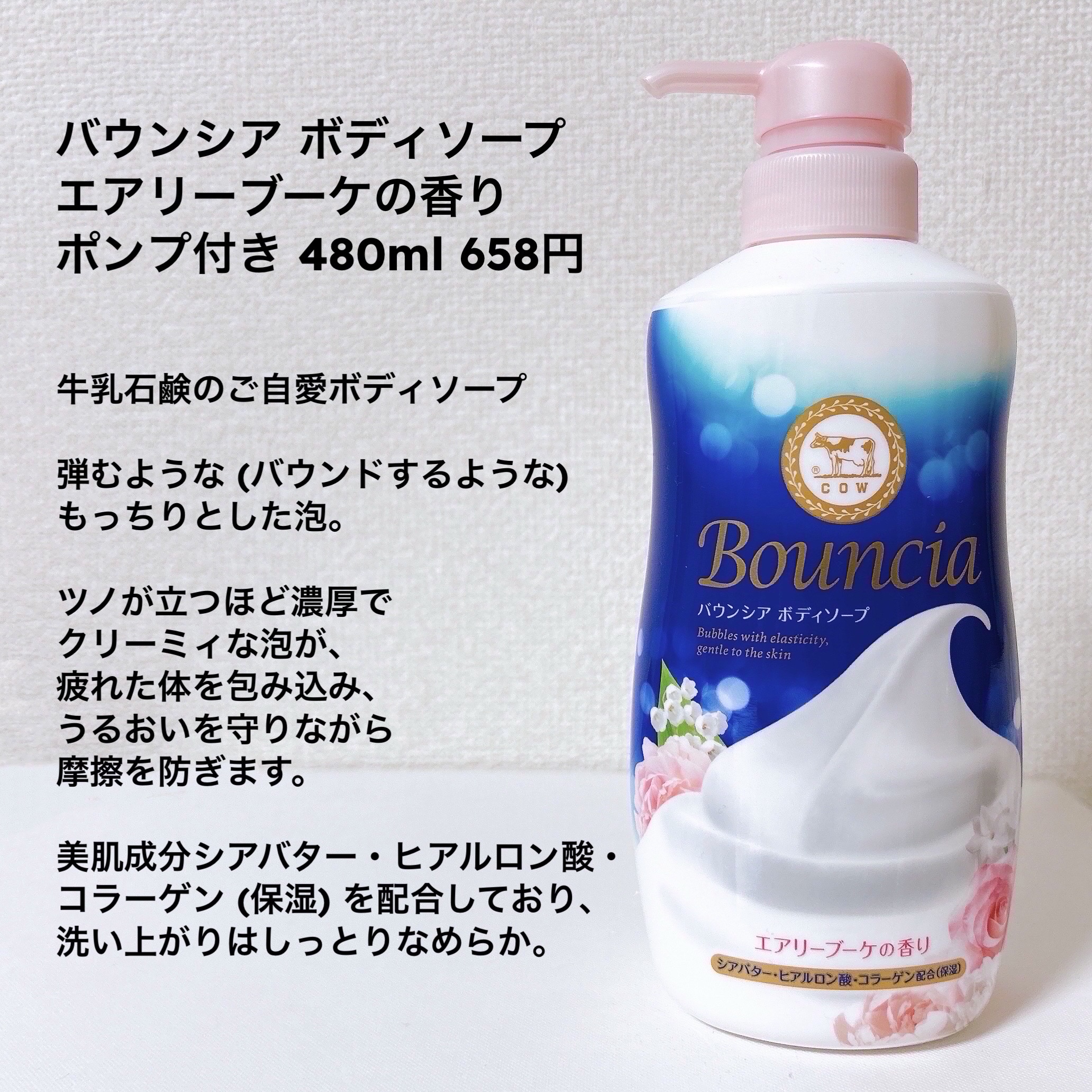 バウンシアのエアリーブーケの香りを買っちゃいました🌸 濃厚な泡は変わらず、フローラルの女の子〜な香りに包まれます😊 ポンプが淡いピンクになっていてバスルームが可愛くなるところも推し!🎀🫧💕🎧 肌の弱い私にはとっても心強い味方の牛乳石鹸🥺💓🐮 洗い上がりもしっとりで大満足です👌💕