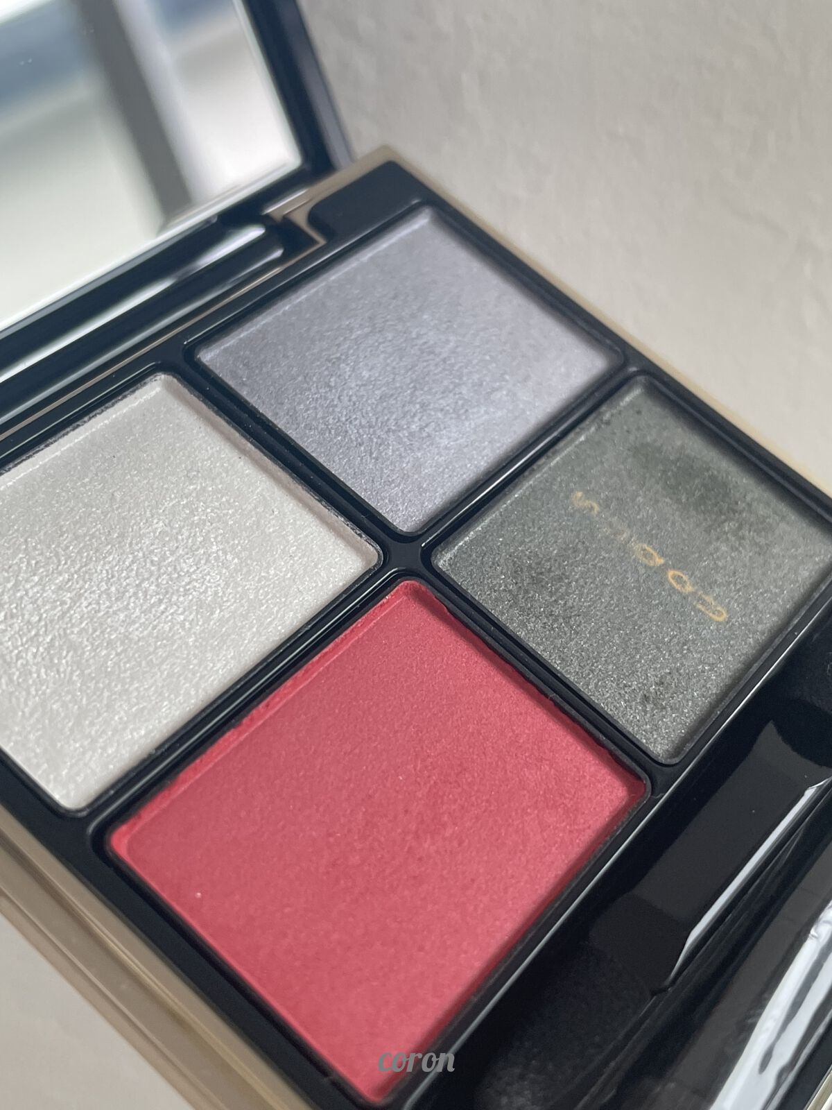 左上:キラキラしたピュアホワイト。結構しっかり白い。右上:青みを感じるブルーグレー。左下:マットな質感のコーラルレッド。右下:シルバーラメ入りのモスグリーン。#SUQQU#デザイニングカラーアイズ#旬霞