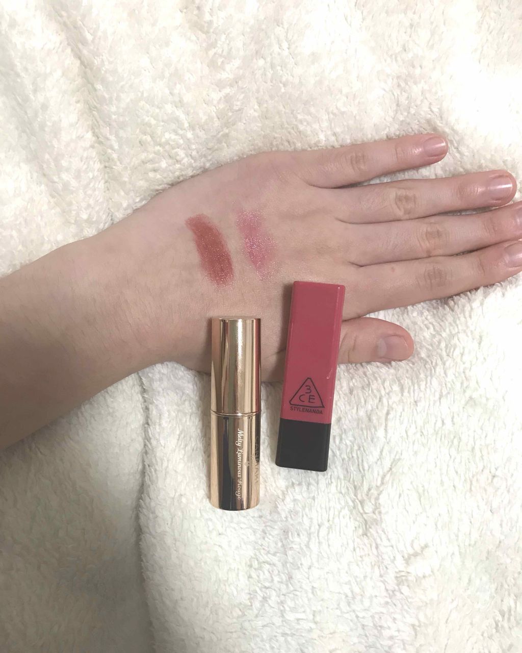 3CE BEBECOLORLIPBALM#HUSH発色は見た目よりも少し明るめで、艶もあるし発色いいのですがちょっと塗りにくい(T_T)乾燥しやすいのもありリピートはなしです(;゜0゜)...