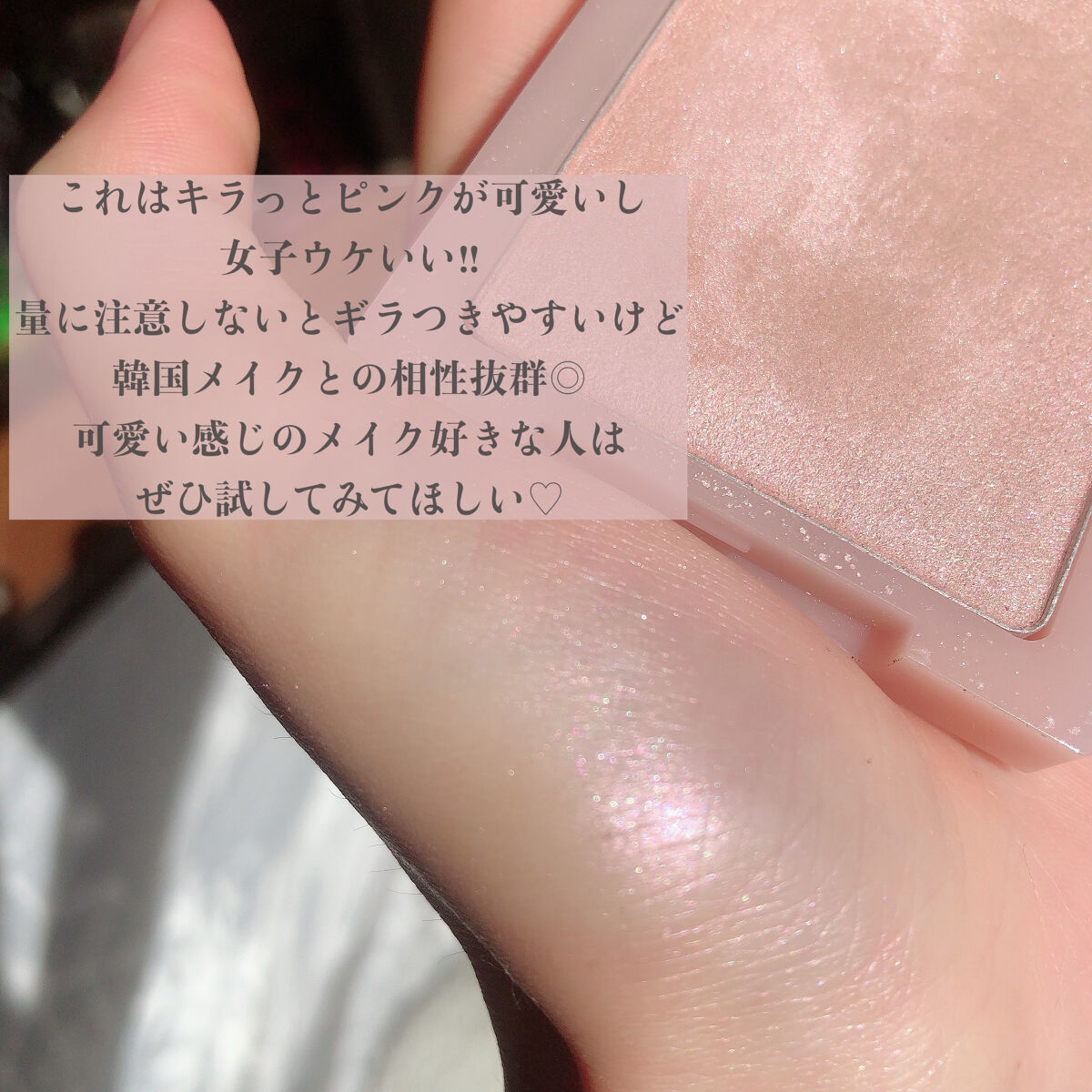 再販品なんだけど、とにかくおすすめ‼︎ キラッよりも、つや〜んな仕上がりが好きだから とにかくこれは好みにばっちりハマった♡ 店頭で見かけたら手に取って試してほしい! ベースはいつもと一緒なのに 「肌綺麗」とか「どこのファンデ?」とか言ってもらえるハイライト✨ アイシャドウとして使っても、ツヤがいい仕事してくれるから持っておいて損なし! 質感もツヤ感も大好き。 素肌感を大事にメイクを作りたい人は好きだと思う! しかもこのハイライトは、ミラーもついてて小さめだからポーチに入れておくとお直しコスメとしても大活躍です◎ 光を主張させたい時にオススメ! 指に取ったのをそのまま付けるんじゃなくて トントンってつけたら違う指で伸ばすと綺麗に仕上がる🪞キャンメイクのハイライトの中で1番好きかも! これがないと顔が完成しないと思わせた必要不可欠なハイライト! ピンク色とラメが可愛くて、血色感出て顔が華やかになる🌟 ピンクのアイシャドウをよく使う人や、韓国メイクが好きな人は出番が多いと思う!