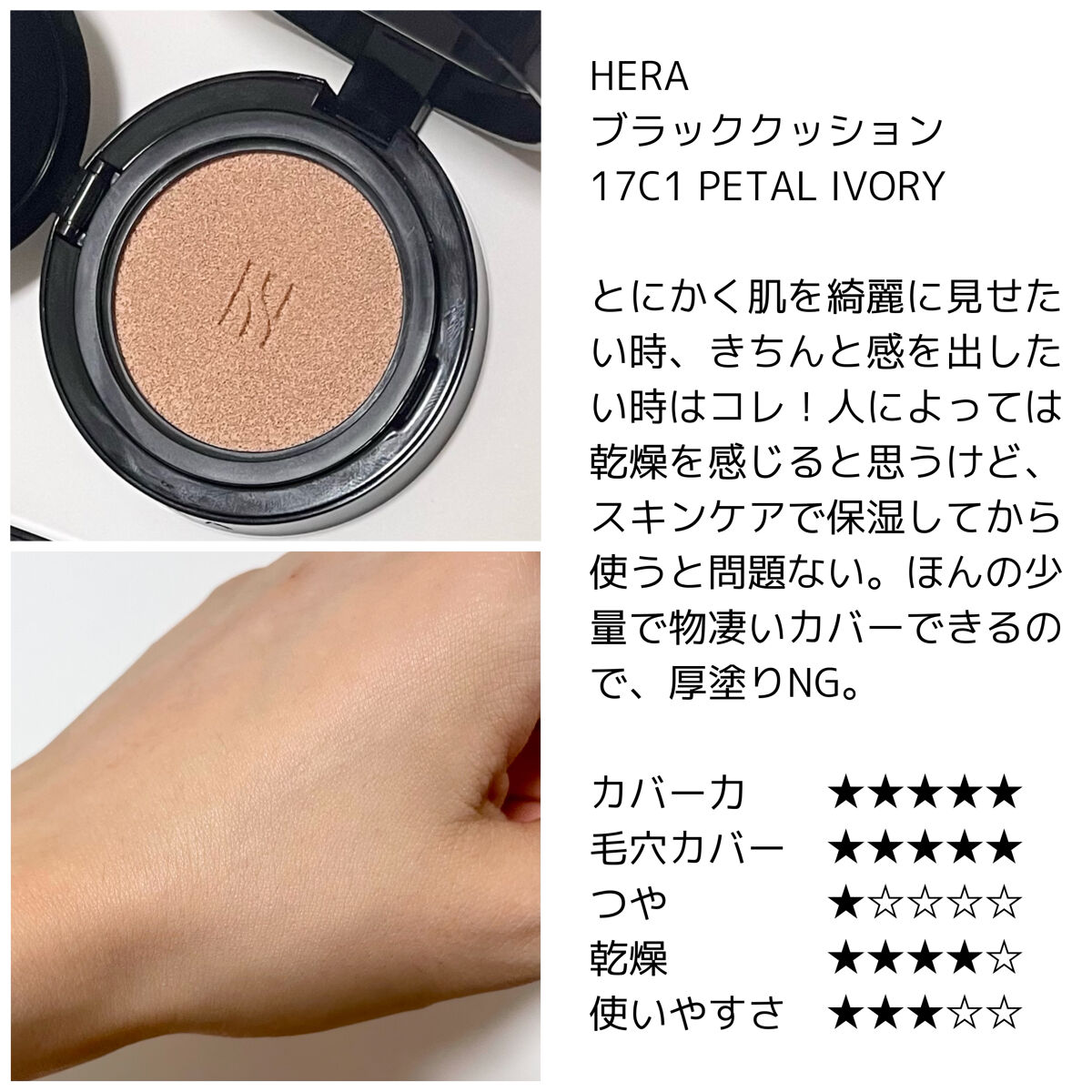 手持ちクッション2022年夏TOP3特に気に入った3つはパウダーなしでも快適に過ごせる(パウダーあればなお良し)のに、肌表現も綺麗なクッションたち♡※星は3つを比較した時の感想ー順不同ー①GIVENCHYタン・クチュール・クッションC110セミマットだけど、手持ちの中では1番マット仕上がり。でも乾燥はあまり感じない。ネットタイプで、使い終わる頃は(まあまあ残っているのに)パフに中々ファンデが付かない。カバー力 ★★★★☆毛穴カバー ★★★★☆つや ☆☆☆☆☆乾燥 ★★★☆☆使いやすさ ★★★☆☆②HERAブラッククッション17C1PETALIVORYとにかく肌を綺麗に見せたい時、きちんと感を出したい時はコレ!人によっては乾燥を感じると思うけど、スキンケアで保湿してから使うと問題ない。ほんの少量で物凄いカバーできるので、厚塗りNG。カバー力 ★★★★★毛穴カバー ★★★★★つや ★☆☆☆☆乾燥 ★★★★☆使いやすさ ★★★☆☆③TIRTIRマスクフィットオールカバークッション21NIVORY程よいカバー力とつや寄りのセミマット、厚塗り感がない、欲しい機能と無難さを詰め込んだクッション。短所が見つからなくて、なんだかんだ1番使いやすい。カバー力 ★★★☆☆毛穴カバー ★★★☆☆つや ★★★☆☆乾燥 ★☆☆☆☆使いやすさ ★★★★★#ベースメイク比較#ベースメイク#おすすめクッションファンデ#クッションファンデ#クッションファンデーション#ファンデ#ファンデーション#ベスコス#ベストコスメ#GIVENCHYBEAUTY#HERA#TIRTIR#ジバンシイビューティー#ヘラ#ティルティル#コスメ#コスメ好きさんと繋がりたい