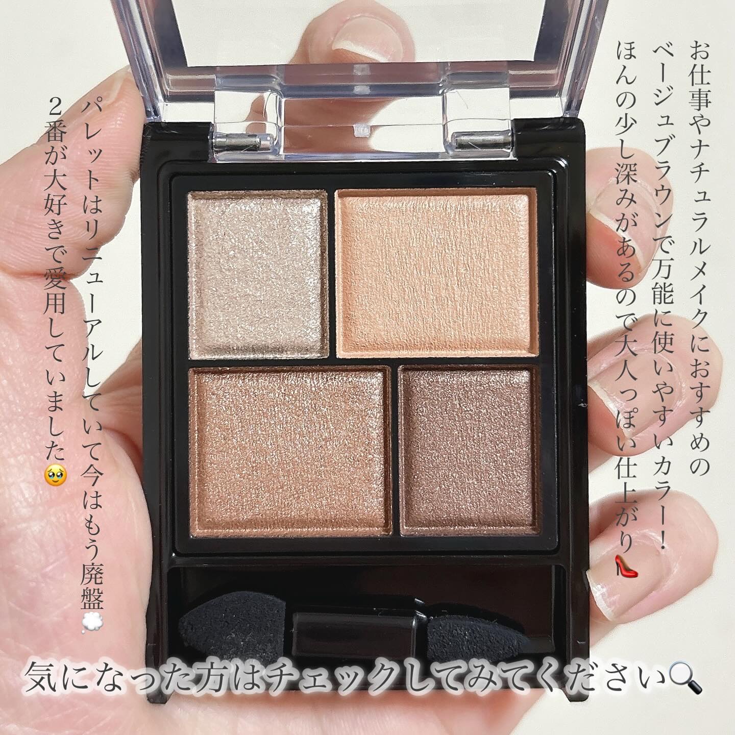 ヌーディで洗練されたブラウン💁♀️ ツヤやかに目元を彩る 質感ミックスのアイカラーパレット グリッター・ソフトマット・パールの 異なる3つの質感の4色が入ったアイカラーパレット♥ 重ね方を変えることでニュアンスの変化が生まれ、 印象の異なるアイメイクが楽しめる🙆♀️ なめらかパウダーがまぶたにしっとりと密着して、美しい発色が続くアイシャドウ👏 しっとりするので使いやすい◎ 発色も良くて使いやすいです🙋♀️ めっちゃ可愛いです♥♥♥