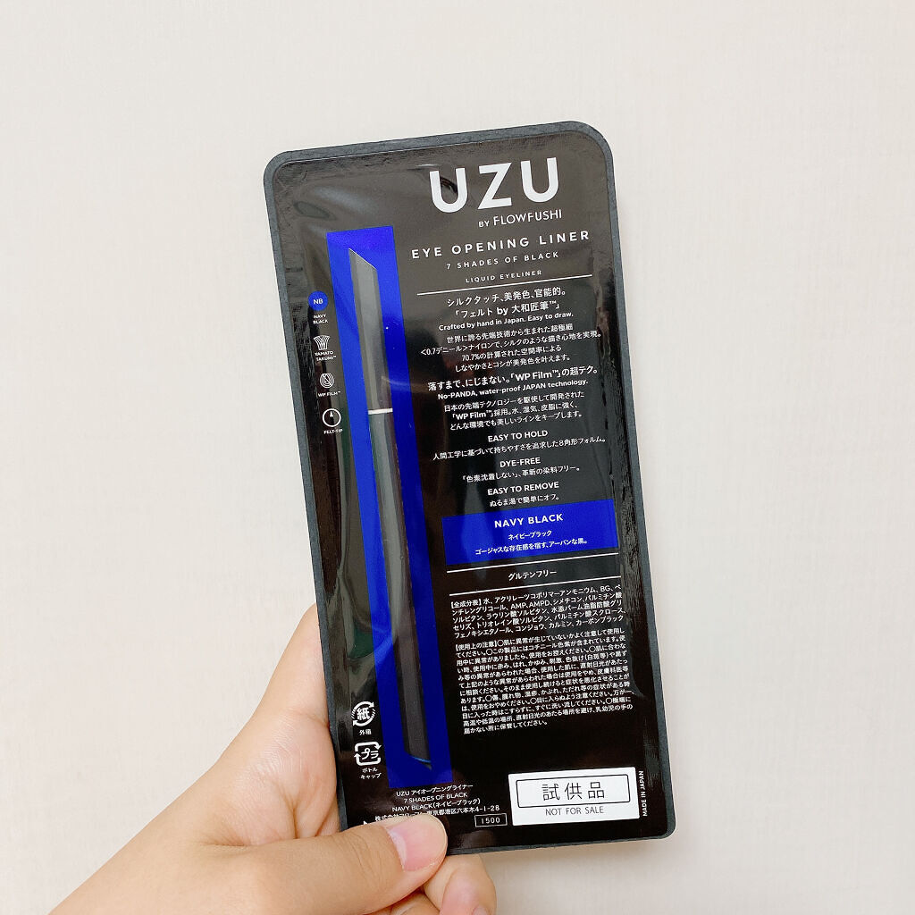 肌を白く魅せてくれる ネイビーブラックカラーです🤗 筆先はフェルトタイプですが 筆タイプの様に描きやすいです😌✨ 発色と描き心地は良いのですが ぽろぽろととれてきてしまって 目元が汚くなってしまうので 正直うーんなアイライナーです😰 ウズさんのアイライナーを 以前使用した際も 同じ様にぽろぽろと とれてきてしまっていたので 敬遠していたのですが 今回もその現象が起きてしまい とても残念です😭