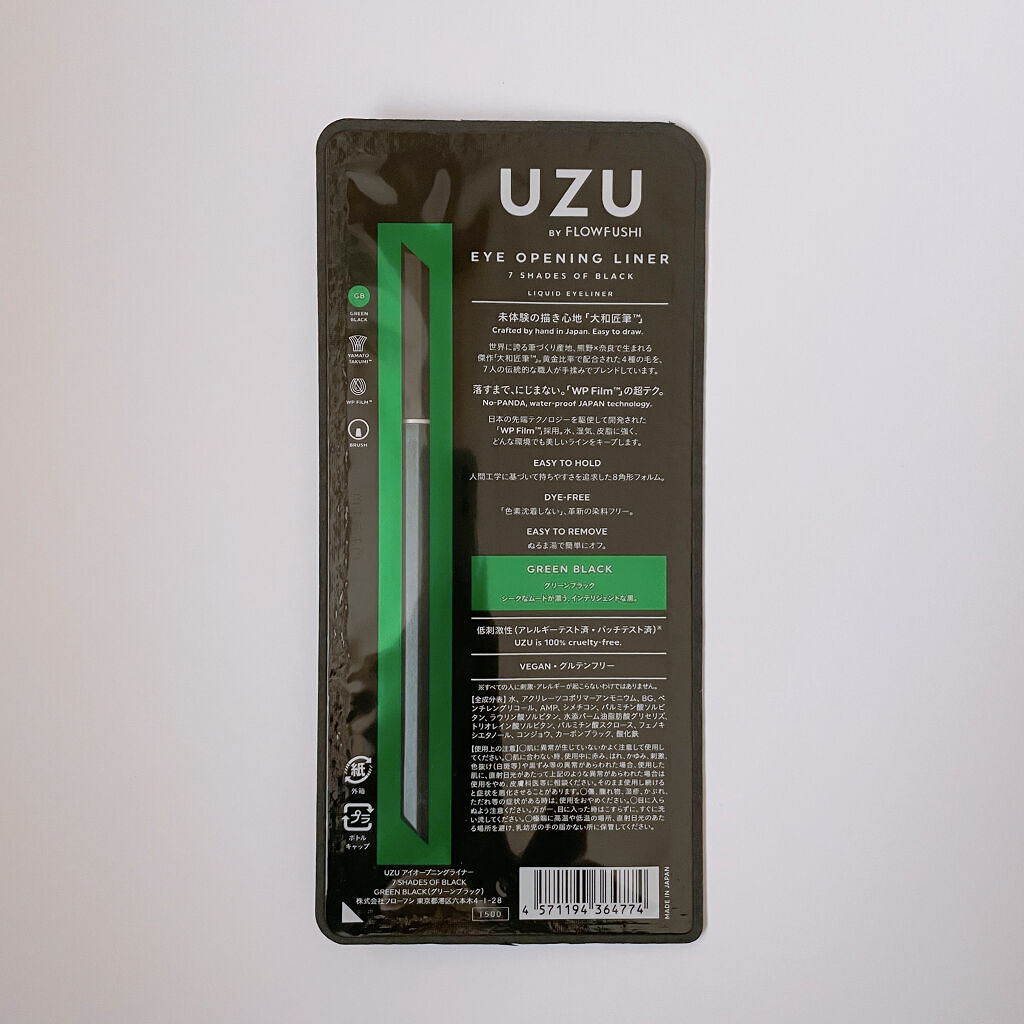UZUのオープニングライナー、グリーンブラックです。とにかく落ちないのがすごいです。擦れても全然大丈夫!濃いグリーンなので、ちょっと小慣れ感が出るのもお気に入り。上目尻にすーっと引くととてもおしゃれです。...