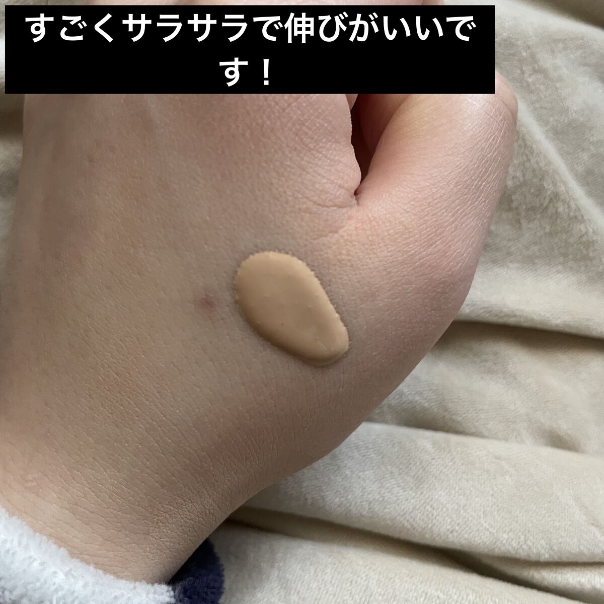 【良いところ】すごくサラサラで伸びが良く、少量で顔全体に伸ばせるところです!塗ったあともサラサラで、ベタつきにくく、乾燥が気にならないです!そして、日焼け止め効果も付いていて、無香料な所もいい点です! 【イマイチなところ】サラサラすぎて手に出した時に垂れそうになります( ; ; ) また、鼻横に溜まってしまいました。鼻横以外は本当に綺麗な仕上がりです!!! 正直、サラサラすぎて蓋を開けてドバっと出てしまったのがショックでした(試供品のみだと思いますが)また、鼻横は結構どれを使ってもよれてしまいますが、こちらの商品も寄れてしまったのが残念でした。 でも購入はしないかなぁ、と言った感じです。 普通肌の方には本当に全力でおすすめできる商品だと感じました!ぜひ肌質に合いそうな方、リキッドファンデーションを塗り広げるのがおっくうな方は使ってみてください!サラサラで最高です!