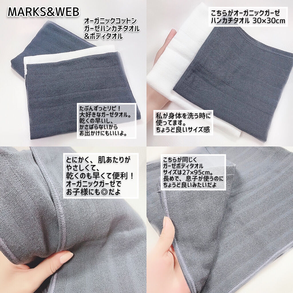親子で愛用💙やさしいオーガニックガーゼハンカチとガーゼボディタオル🥰★MARKS&WEBオーガニックコットンガーゼハンカチタオル1枚682円(税込)ホワイトとネイビーを1枚ずつリピ💖★MARKS&WEBオーガニックコットンガーゼボディタオル1枚1199円(税込)息子用に大きめサイズのネイビーをリピ💙以前にお風呂ではガーゼで洗ってるよ✨ってレビューをした気がしたけど、これです💖ハンカチタオルといっても、わりと大きめで、私はこちらで、身体を洗ってます💖息子がわりと、身体の肌が弱めで、痒がる事が多く、何か良いのないかな?と思ってこちらにたどり着いたの。MARKS&WEBのオーガニックコットンガーゼは、肌に負担をかけずに洗えるし、とてもやさしい🥰素材は、綿100%(オーガニックコットン)生産国日本💖タオルハンカチのサイズは35×35cm。💙ボディタオルのサイズは27×95cm。シンプルな、二重織ガーゼのタオルで、オーガニックコットンのやさしい安心感が💕手ぬぐいのような軽さと、薄さで、やさしく洗えるのが最高です✨普通に旅行用等で、どんな使い方もできるし、◎すぎるの😊粗い打ち込みで織り上げられてるガーゼタオルなので、やわらかくて、さらり。水分をすばやく吸収!!通気性にすぐれているから、乾きも早くて衛生的に使えるから、本当に良き🥰💖ハンカチタオルは、私は身体洗う時に使ってるけど、持ち歩きに便利なサイズで、ハンカチ代わりにも◎小さなお子様とのお出かけにもガーゼハンカチは必須だから、(私はそうだったw)お子様いらっしゃる方にもおすすめ💖💙オーガニックコットンガーゼボディタオルの方は、一般的なフェイスタオルに比べて、10cm程長く、頭に巻いたり、首に掛けたり、背中を拭いたりしやすい長さ✨息子的に、とても使いやすいみたいでお風呂でも、ガンガン使ってるけど、全然ヘタレてないしね😊ただ、愛用歴が長くなってきたので、新しいのを買っておきました💙💙気になった方は、MARKS&WEBの公式より見てみてー✨お近くに店舗がある方はお店で見てみてね😊#MARKS&WEB#オーガニックコットンガーゼハンカチタオル#オーガニックコットンガーゼボディタオル