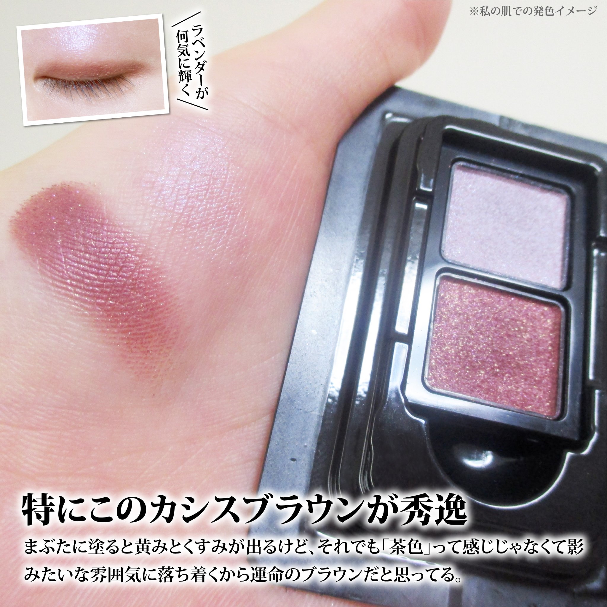 カネボウのアイカラーデュオ 色はブラウンの06 Sweet Jealousy パープルとブラウンの08 Elegant Ironyをチョイス。 06のSweet Jealousyはブルベでも使えるブラウン。締め色のブラウンが黄みのないブラウンでしかも濃いめ。 08のElegant Ironyは夏の人が好きそうな淡いパープル。発色に物足りないので無印のクリームアイシャドウのスモーキーパープルを下地にしています。