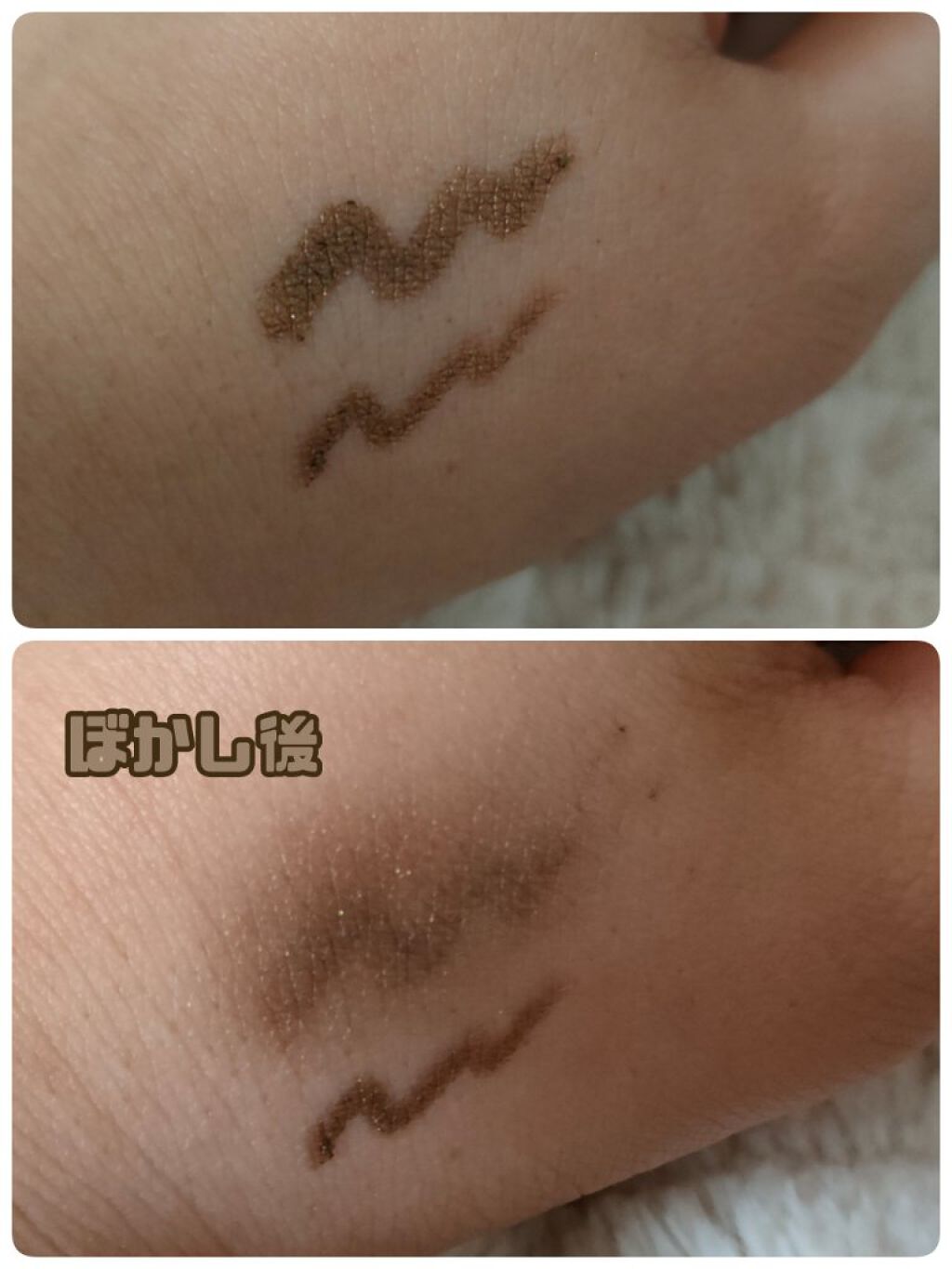 お色がカーキゴールドで ブルベの私は心配でしたが アッシュがかった色味なので パーソナルカラー問わずに使えるかと思います。 3mm芯で太めですが 調節しやすいので細くも描けます。 ぼかしやすくてアイシャドウにもなるので これひとつでグラデーションがつくれるのです。 時短アイテムにもなりますね。