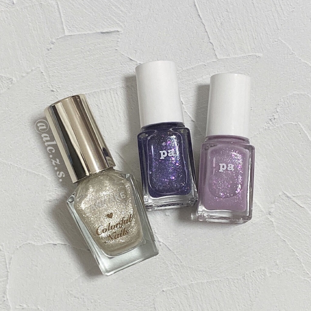 本日のネイルは#paネイルカラープレミア3色を使用〜✨E005E006の、透け感ネイルで仕上げてAA120の、ブルーラメをのせました。 3色とも好きなカラーです。E005とE006の透け感ネイルはめちゃくちゃお気に入りでどっちも、もぉすぐ使い...