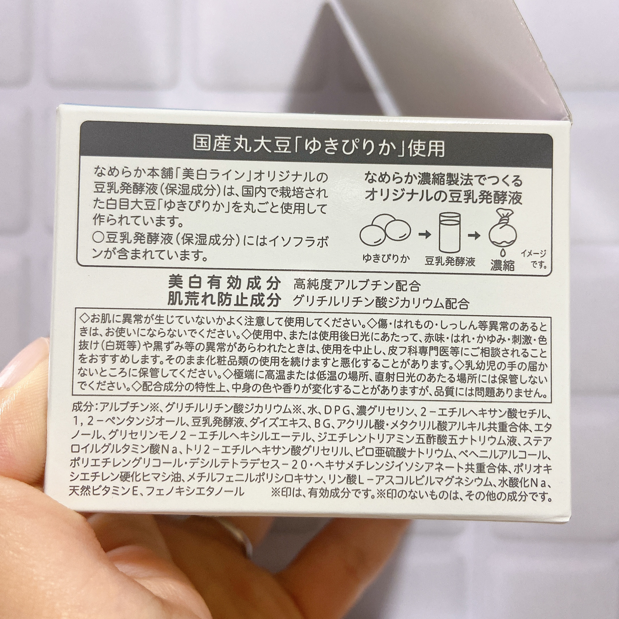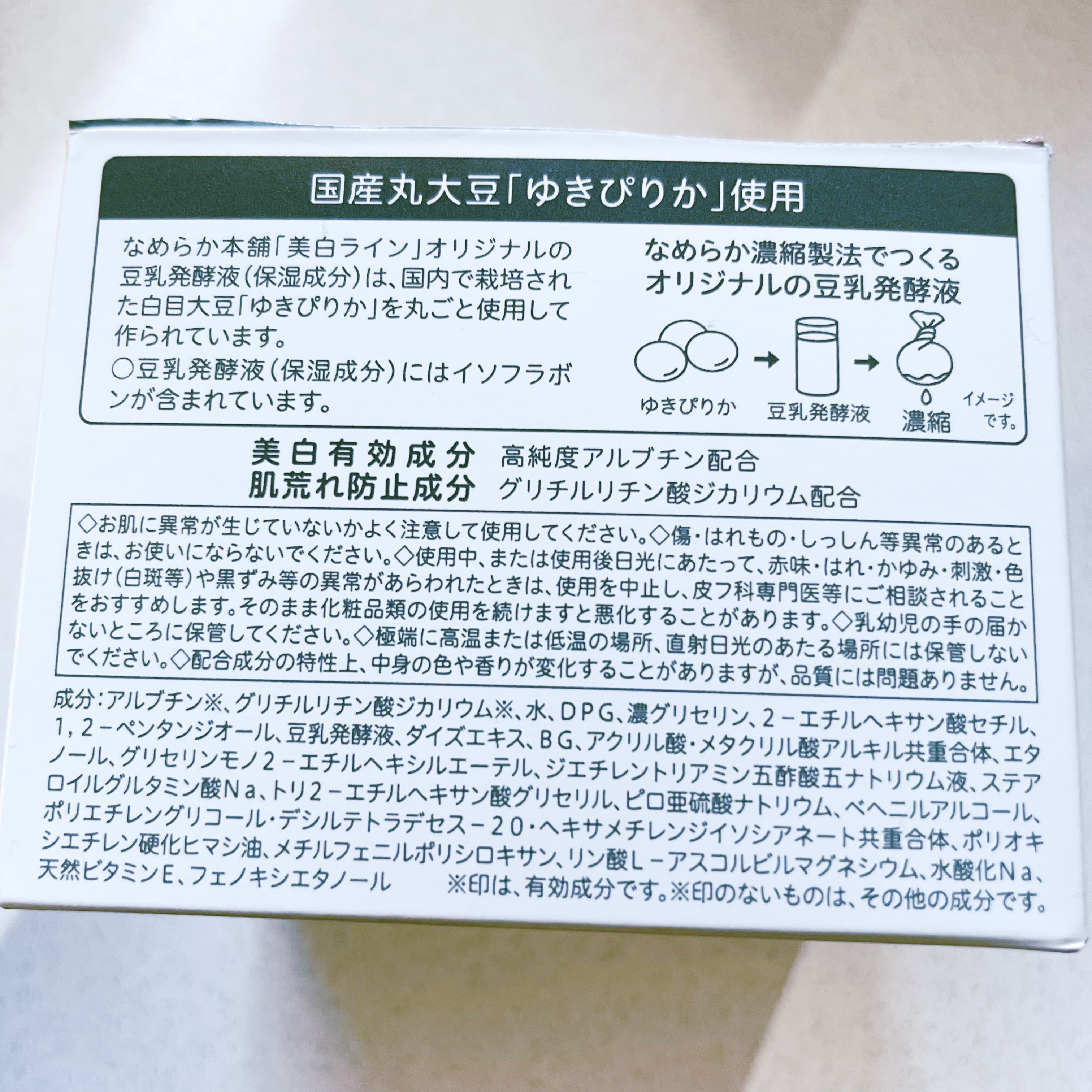 - 有効成分 アルブチン、グリチルリチン酸ジカリウム その他の成分 水、DPG、濃グリセリン、2-エチルヘキサン酸セチル、1,2-ペンタンジオール、豆乳発酵液、ダイズエキス、BG、アクリル酸・メタクリル酸アルキル共重合体、エタノール、グリセリンモノ2-エチルヘキシルエーテル、ジエチレントリアミン五酢酸五ナトリウム液、ステアロイルグルタミン酸Na、トリ2-エチルヘキサン酸グリセリル、ピロ亜硫酸ナトリウム、ベヘニルアルコール、ポリエチレングリコール・デシルテトラデセス-20・ヘキサメチレンジイソシアネート共重合体、ポリオキシエチレン硬化ヒマシ油、メチルフェニルポリシロキサン、リン酸L-アスコルビルマグネシウム、水酸化Na、天然ビタミンE、フェノキシエタノール