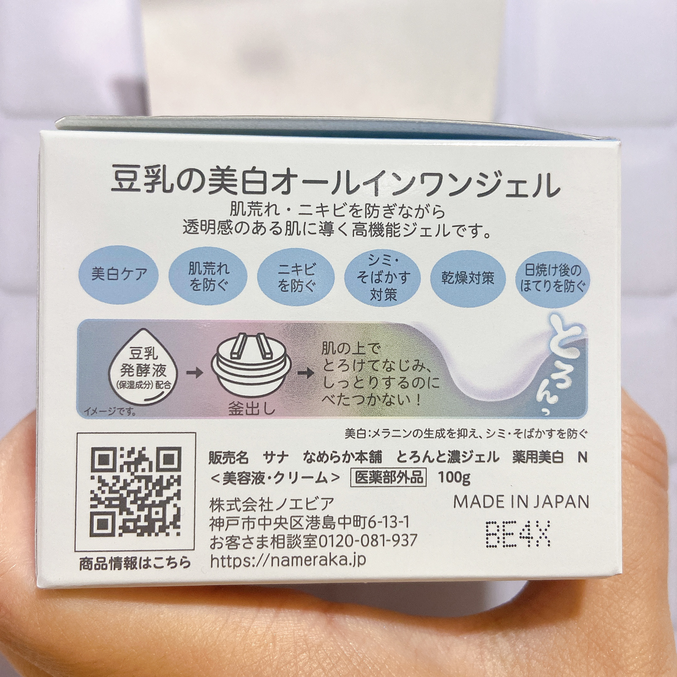 - 販売名:サナ なめらか本舗 とろんと濃ジェル 薬用美白 N 1つで6役(化粧水、美容液、乳液、クリーム、パック効果、化粧下地)のオールインワンジェルです。お肌の上でとろけるようになじみ、みずみずしく変化するジェルで、お肌の奥までぐんぐん浸透*します。形状記憶ジェルが、お肌に膜を張ってうるおいを閉じ込め、なめらかなふっくらもち肌に導きます。パウダーファンデーションともピタッと密着するので、夜のお手入れはもちろん、朝の時短ケアにもおすすめです。 *角層まで