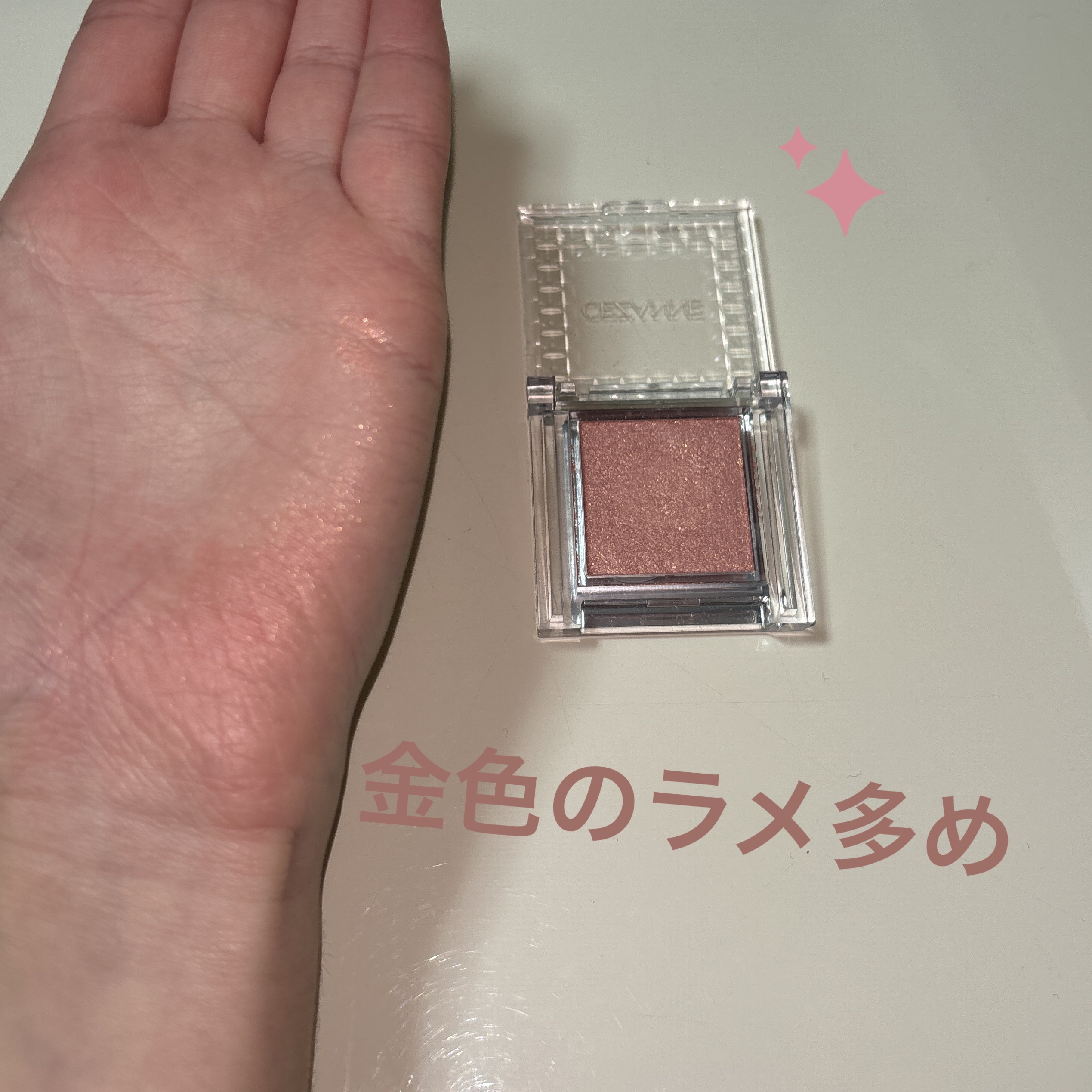 ゴールドラメが可愛らしい単色アイシャドウ ゴールドピンクの名の通り 塗ってみるとピンク色自体はそこまで濃くなく 淡い発色でゴールドのラメがキレイに輝いてました もしかしてチークにも使えるのではと思い 使ってみたところちょっとラメが強めかもしれませんが 可愛らしかったのでチークとしても使える かなりコスパのいいアイシャドウでした!