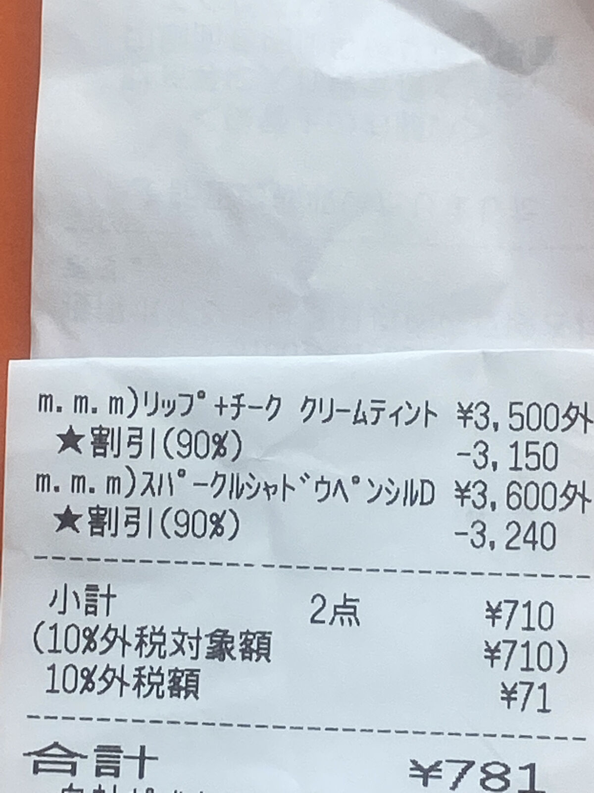 あの高級コスメが90%オフ!?/追記使用期限と品番名が間違っていたので訂正しますm.m.m(ムー)スパークルシャドウペンシルDUO02 トワイライトピンク/ワイルドチェリー3960円→396円嘘でしょと思う方は最後の写真のレシート見てくださいほんとです笑(個人情報のところは隠してます)コスメキッチンの前を通って思わずおったまげた90%オフ私の目が狂ったのかと思いました思わず購入してしまいましたなんでこんなに安いのかというと期限が近いから使用期限は2022/8再来月なのでこのお値段だそう使用感まずアイシャドウスティック瞼に直接塗るにはちょっと硬めかももう少し柔らかいと良いのにとは思うでも色味がどタイプです!ピンクブラウンというかピンクベージュ系かもぼかさず塗ると締め色になるし、ぼかすとアイホールに使えるような色味です落ちにくく色飛びなどもなかったですし、持ちはかなり良いですアイライナーするする描けるし、発色もかなり良さげアイシャドウの色味にピッタリで、少し紫みもあるピンクブラウンうどんみたいな形なので、細くも太くも描けます細く描けてほんとに使いやすいそして落ちにくいです涙でも滲まないm.m.mのコスメは初めてでしたがとてもよく大満足このクオリティが500円以下で試せるのは本当に買いです売り切れ店舗も多いので見つけたら即買いがおすすめです#激盛れアイシャドウ