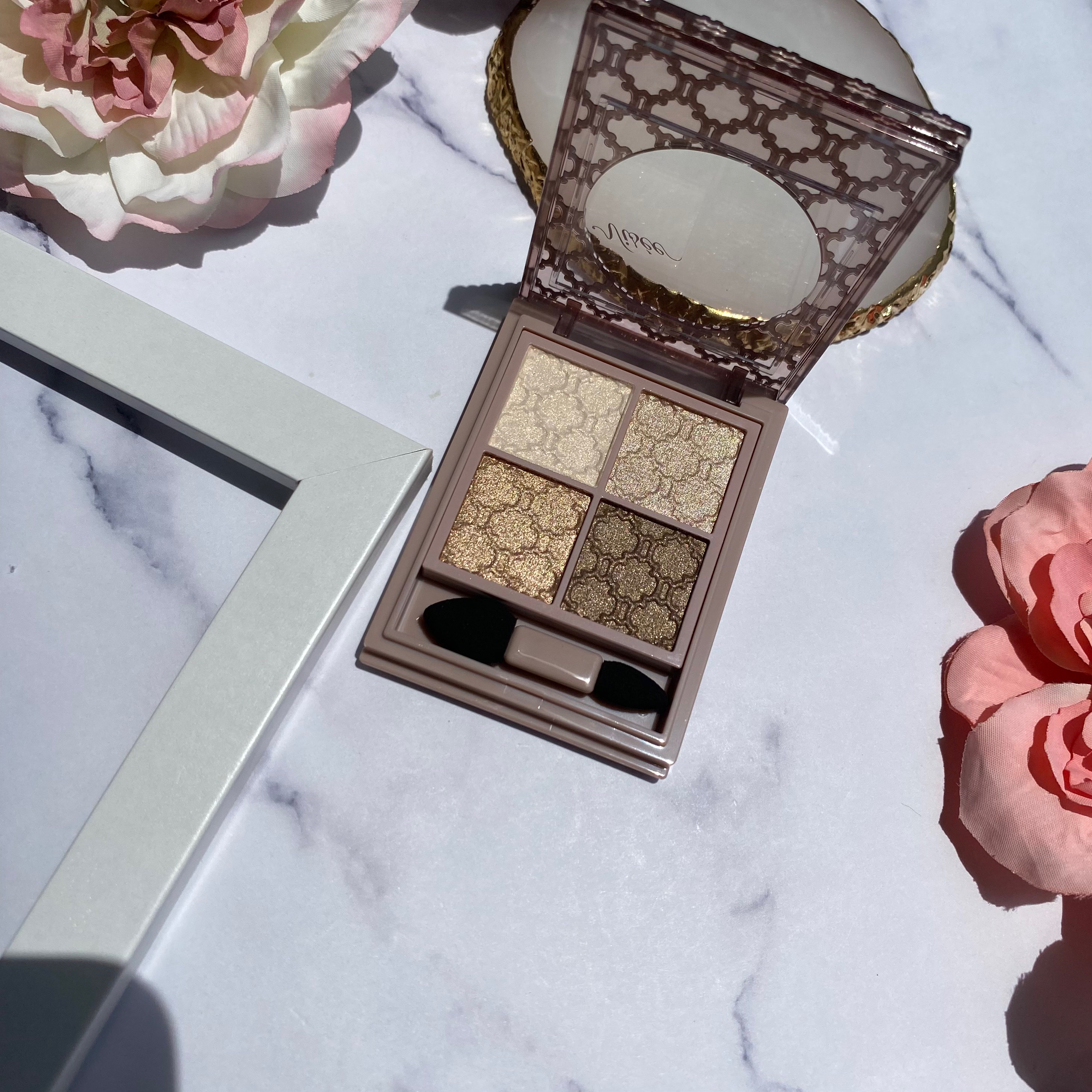 パケがお洒落で可愛すぎる こちら🥺 しっとりタッチのクリーミィベース + 3色のグラデーションカラー の 4色セットアイカラー👀🎨 アイカラー4色にも模様があって可愛い♡ 重ねるだけで簡単にきれいなグラデーション🌈✨ ライトベージュ系は濃くなりすぎないのに きれいに発色して 上品なツヤが出るから どんな時にでも使いやすい! 美容液成分(ヒアルロン酸・スクワラン)配合。 おすすめのアイカラー🥰🌈