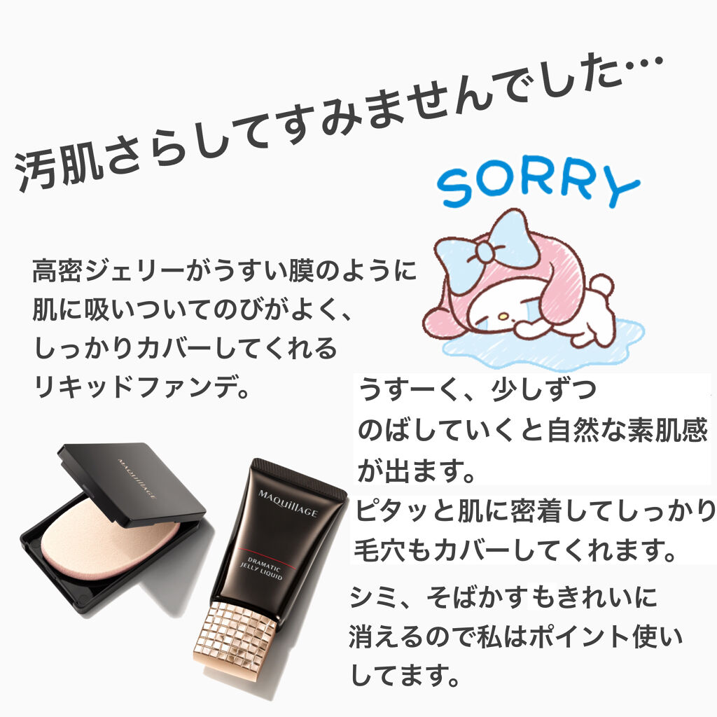 マキアージュ ドラマティックジェリーリキッドオークル00 ファンデーション¥3,200+tax使った感想は素肌感がある高密着なファンデーション🌟SPF30・PA++のため日頃使い向け♡私はいつも標準色より1つ明るめのファンデーションを使っているので今回は00を購入♬薄づきの割にはカバー力あるかな!ただカバーしたくて少しでも塗りすぎると厚塗り感でます(;;)そして乾燥肌の私にはかなり乾燥を感じました😭暖かくなってから使うべきファンデーションだなという印象でした♡ただマットの割には伸びはすごくいいです!なのでマットが好みの普通肌〜脂性肌向けのファンデーション!