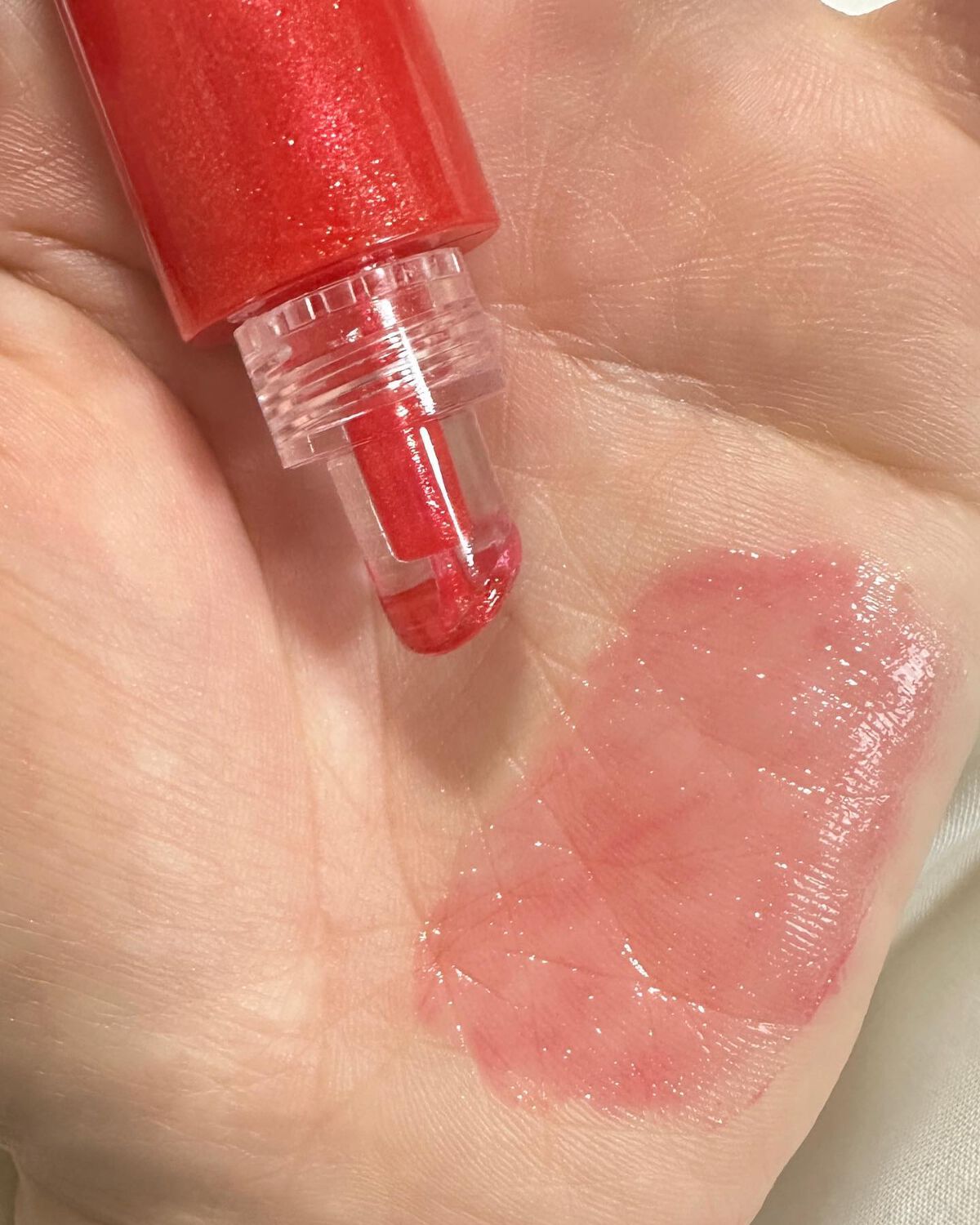 ゴールドラメがぎっしり詰まった粘度のあるテクスチャーで、しっかり保湿してくれる🩵 クリアレッドの発色で、下に口紅を重ねるとさらに可愛さが爆発する〜!❤︎ 落ちやすいけど、ティントじゃないし、可愛いから良し😍