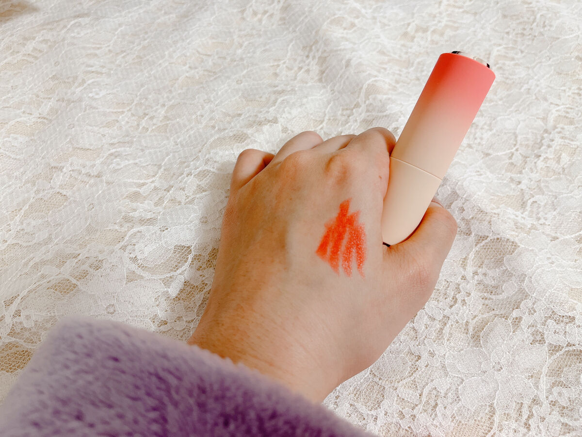 パッケージはマグネット式になっていて、カチッと閉まるのが楽しい。何回もやっちゃう。 カラーはビビットなオレンジレッドで、イエベ春さんにより似合いそうなカラーだと思います。 マットではないけど艶でもないベルベット質感で、上品かつ華やかに見せてくれます。 あとここは少し意外なところだったのですが、色持ちがめちゃくちゃいいです!全然期待してなかったのですが、ティッシュオフしてもめちゃくちゃ色残りして、隠れた名品だと思いました! 限定販売なので話題になってないだけで、実はめちゃくちゃ色持ちがいい商品なんだなと!アエナ等のアウトレットではまだ売っているので気になった方はぜひ!