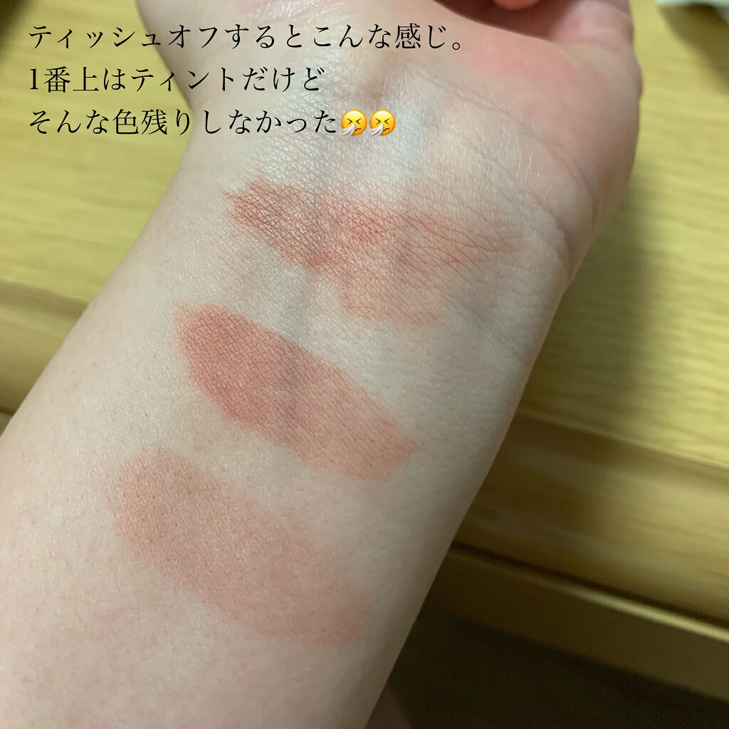 マットは苦手だから本命はシアーだったんだけど…いざ使ってみるとマットの方が気に入った! マットティントは唇に乗せた感覚がないくらい軽く、ほわほわと染まる スティックの方も、発色良すぎかな?と思ったけど肌馴染みがすごく良くで使いやすい 逆にシアーの方は固めで伸びが悪く、唇がカサついてるとムラになっちゃうかも ここでリップを買うなら大人しく人気のマットを買うのが良さげかな 久しぶりに口紅を塗る楽しさを思い出させてくれた! 自己満でもリップ塗ってる自分の方がテンション上がるし、これならマスクにつきにくいからストレスない しかも色出しがセンス良くて、選ぶの大変だった… もっと欲しい〜