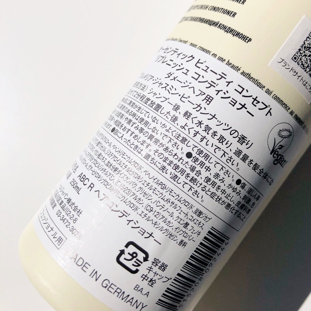 Authentic Beauty Conceptはサステナブルビューティケアブランド。 こちらのリプレニッシュはダメージを受けたデリケートな髪を補修。 栄養満点なヴィーガンフード「メープルシロップ」と「ピーカンナッツ」のエキス(補修成分)を配合。 プルメリア・ジャスミン・ピーカンナッツの香り。 一言で言うならば最近あまり見かけないけど日焼けオイルみたいな香り。 外人さんから香ってきそうな濃厚な甘さ。 シャンプーでは珍しい香り。 シャンプーは少量でもしっかり泡立ち、コンディショナーは緩すぎず髪に馴染ませやすい。 仕上がりはしっとりサラサラで纏まりが良くいつもよりツヤを感じられました! 硫酸系界面活性剤、パラベン、シリコーン、鉱物油、人工色素を含んでないのも嬉しい◎